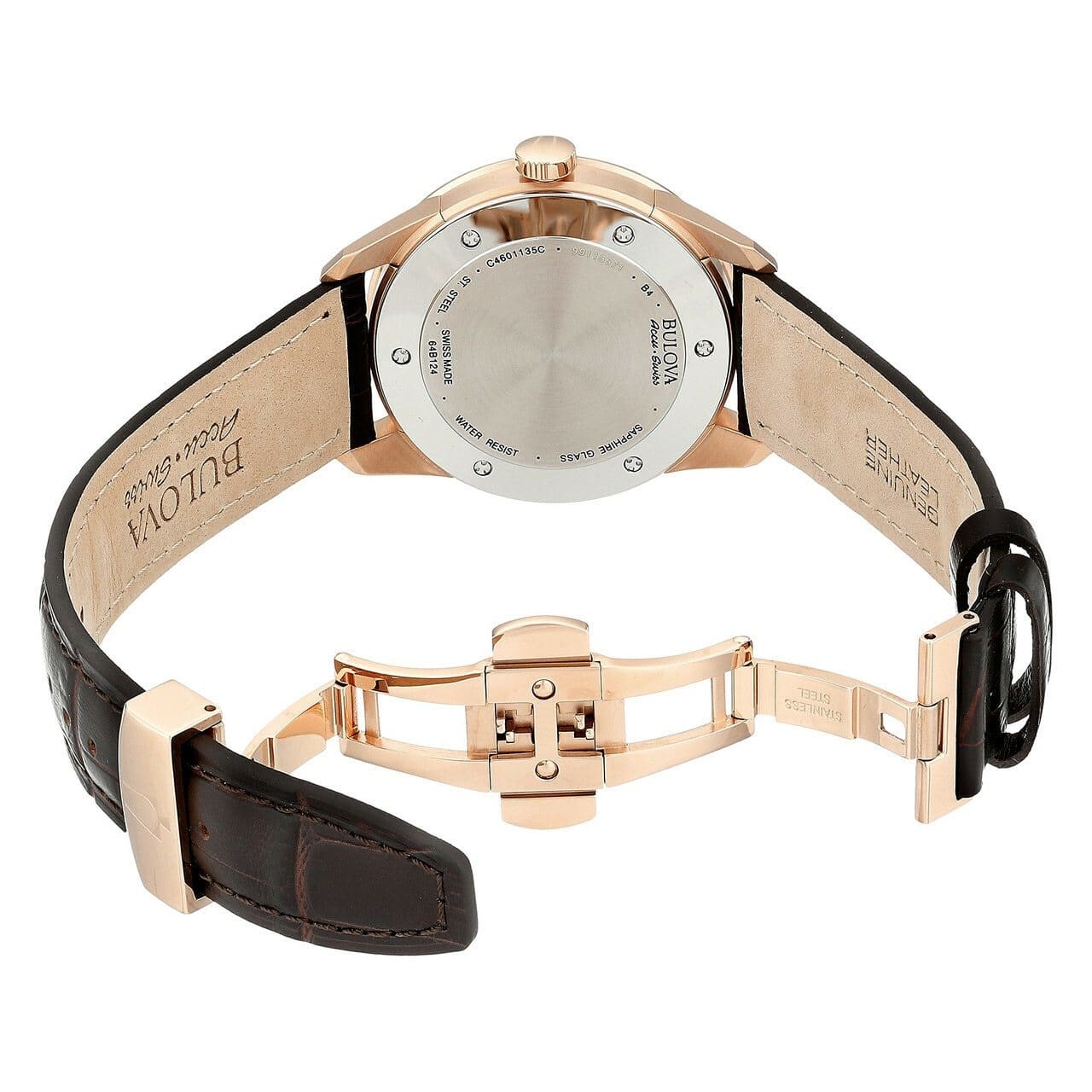 This watch features a brushed and polished finish, showcasing Bulova's commitment to quality craftsmanship. The brown sunray dial is adorned with rose gold tone Arabic numeral and index hour markers, providing a striking contrast that enhances readability. The anti-reflective sapphire crystal protects the dial, ensuring clarity in various lighting conditions.