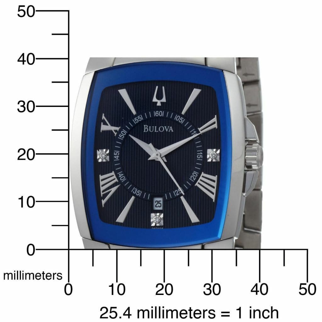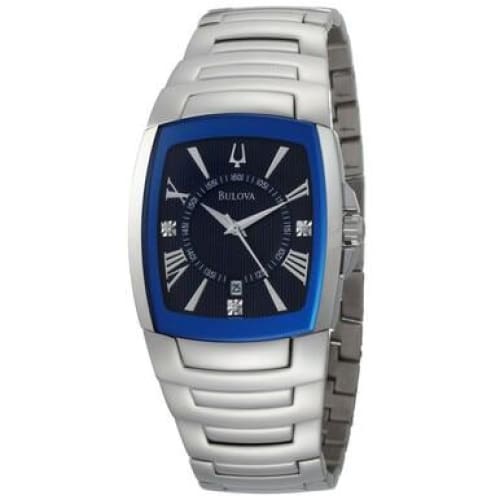 Bulova 96D108 Diamond Accent Men's Watch featuring a black dial, diamond hour markers, and a blue stainless steel bracelet.