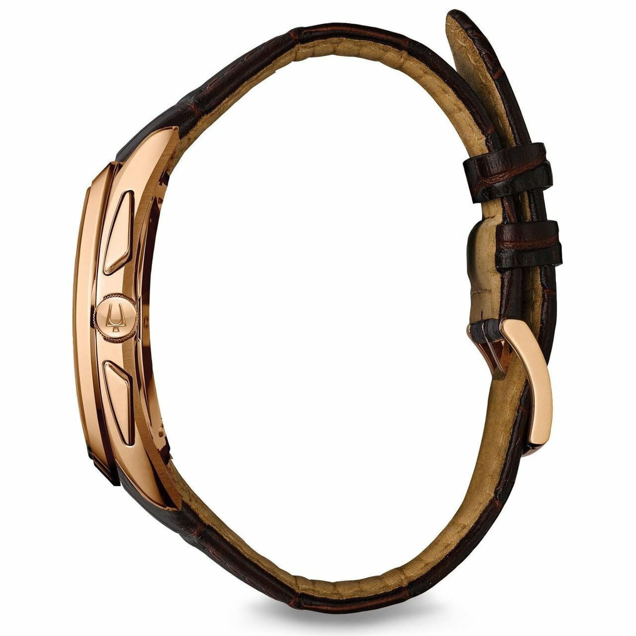 The CURV collection is known for its unique design that allows the watch to conform to the wrist, making it incredibly comfortable to wear. The Bulova 97A124 boasts a beautifully crafted 45mm rose gold-tone stainless steel case that is both durable and stylish. The curved sapphire glass adds an extra layer of sophistication while ensuring clarity and scratch resistance.