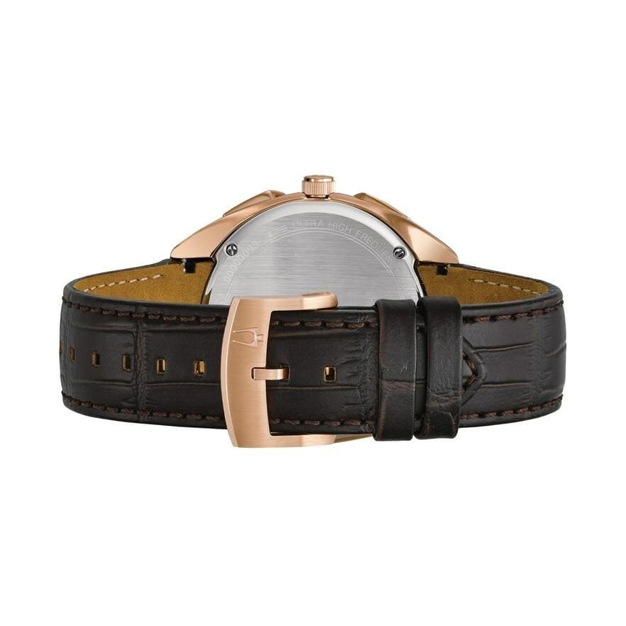 The watch is complemented by a dark brown alligator grain leather strap that adds to its overall elegance. The strap secures with a three-piece buckle closure, ensuring a snug fit on your wrist. The leather material is not only stylish but also comfortable, making it perfect for all-day wear.