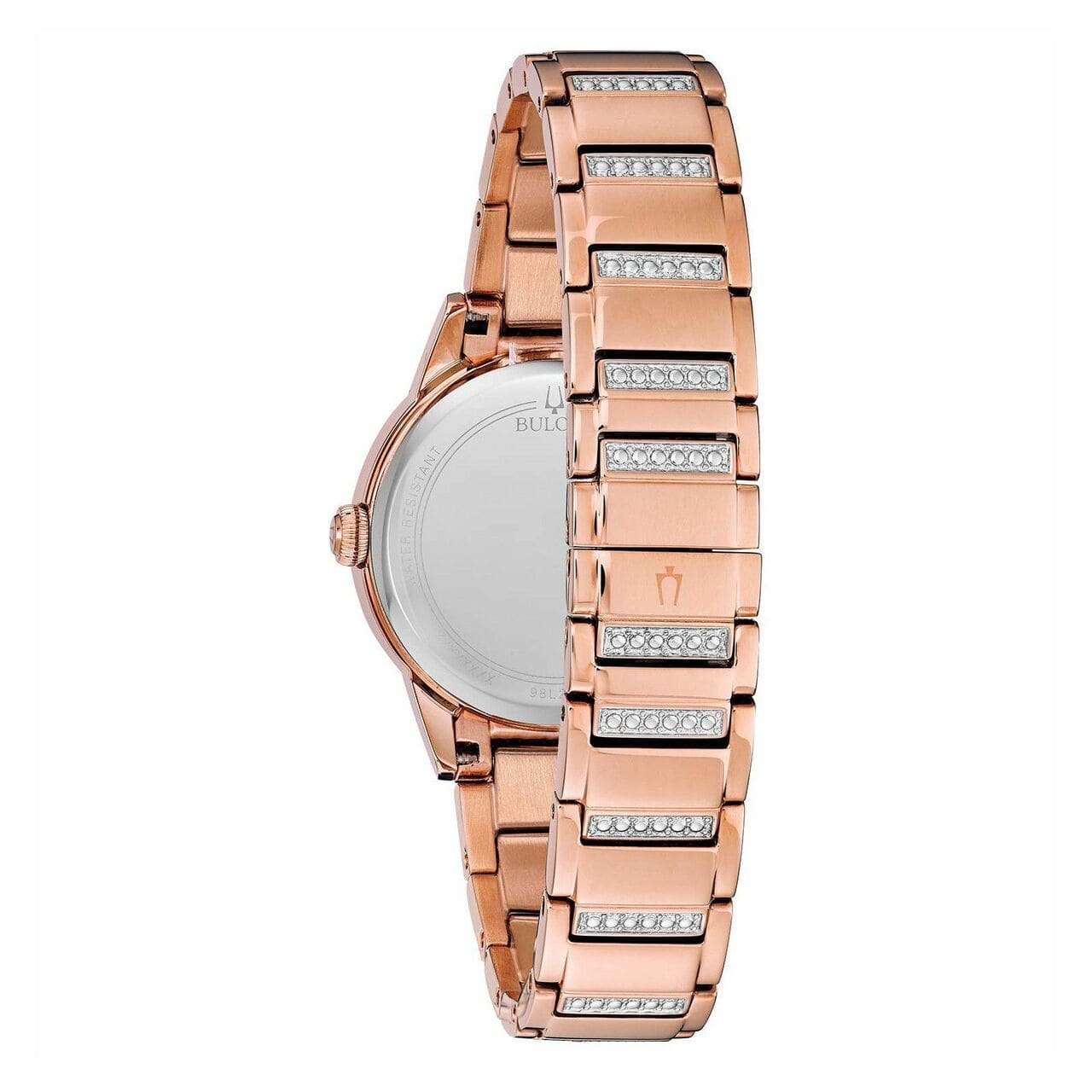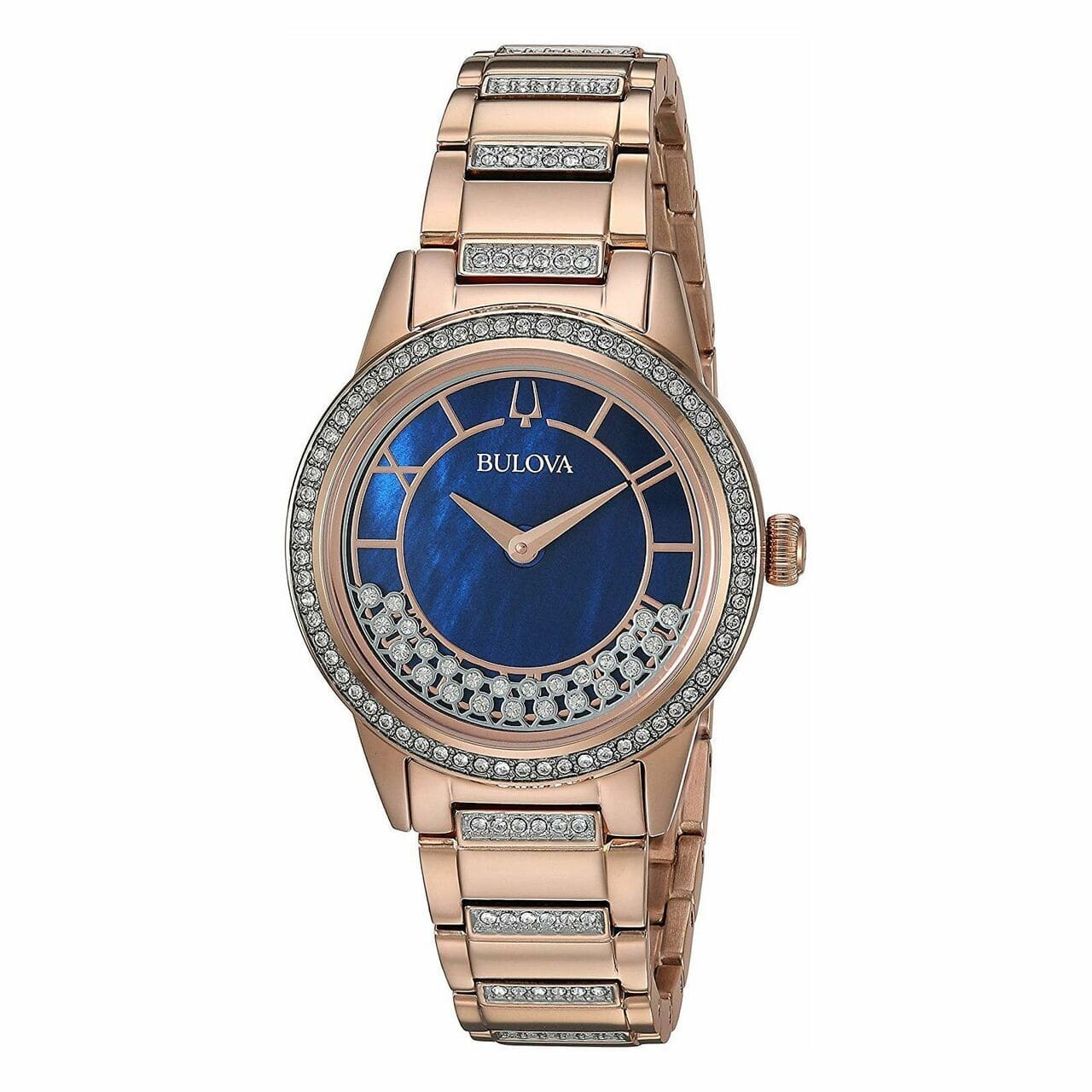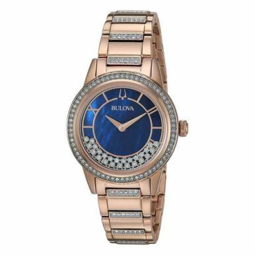 Bulova 98L247 women's watch featuring a rose-gold-tone stainless steel case, blue mother-of-pearl dial, and sparkling crystal accents.