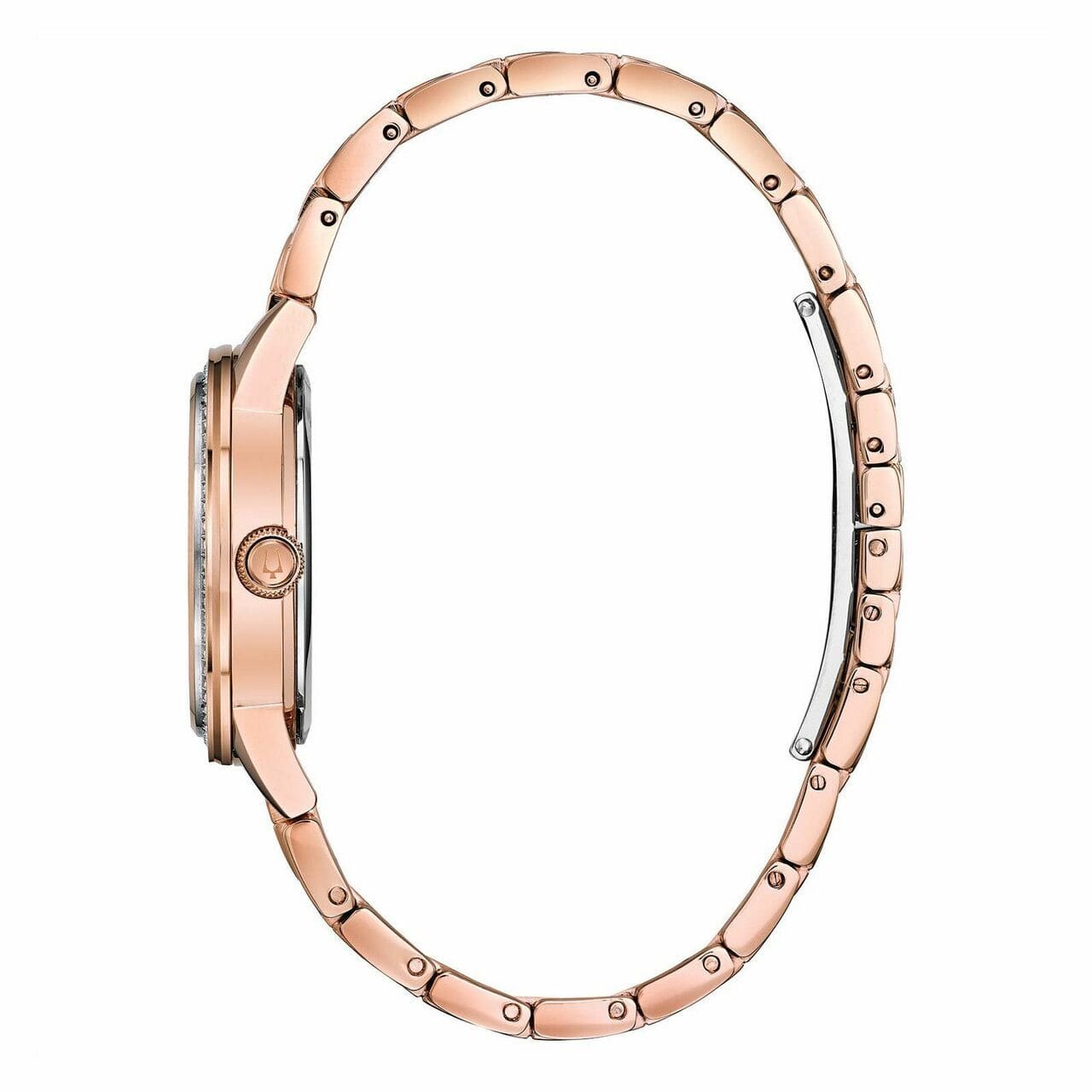 Crafted with a 32mm rose-gold-tone stainless steel case, the Bulova 98L247 is not only stylish but also durable. The case is topped with a domed mineral glass that is scratch-resistant, ensuring that your watch remains pristine even with daily wear. The rose-gold-tone stainless steel bracelet complements the case beautifully and features a secure deployment clasp, providing both comfort and security on your wrist.