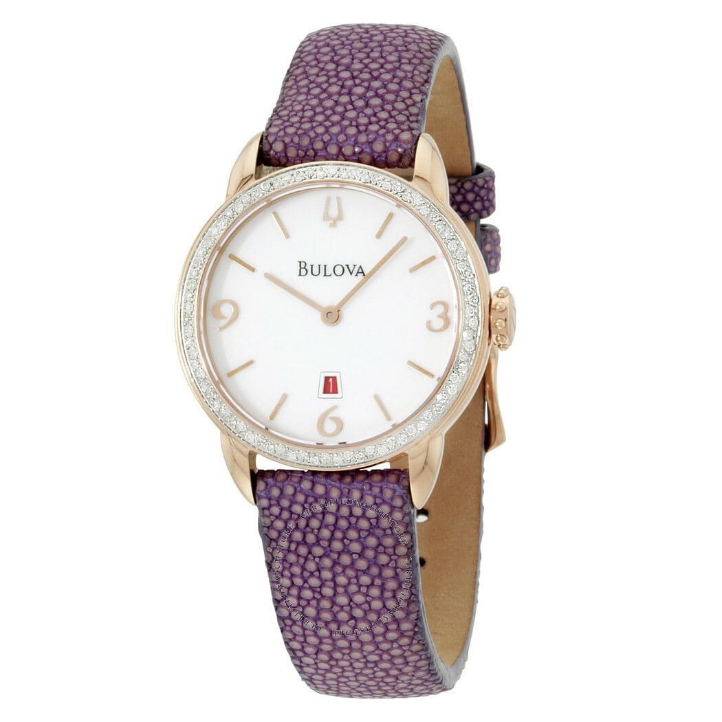 The Bulova 98R196 Interchangeable Purple Stingray Leather Women's Diamond Watch is a stunning addition to any woman's accessory collection. This exquisite timepiece from the renowned Bulova Diamonds collection combines elegance and functionality, making it perfect for both everyday wear and special occasions. With its diamond-studded round stainless steel case and a chic white dial, this watch is designed to impress.