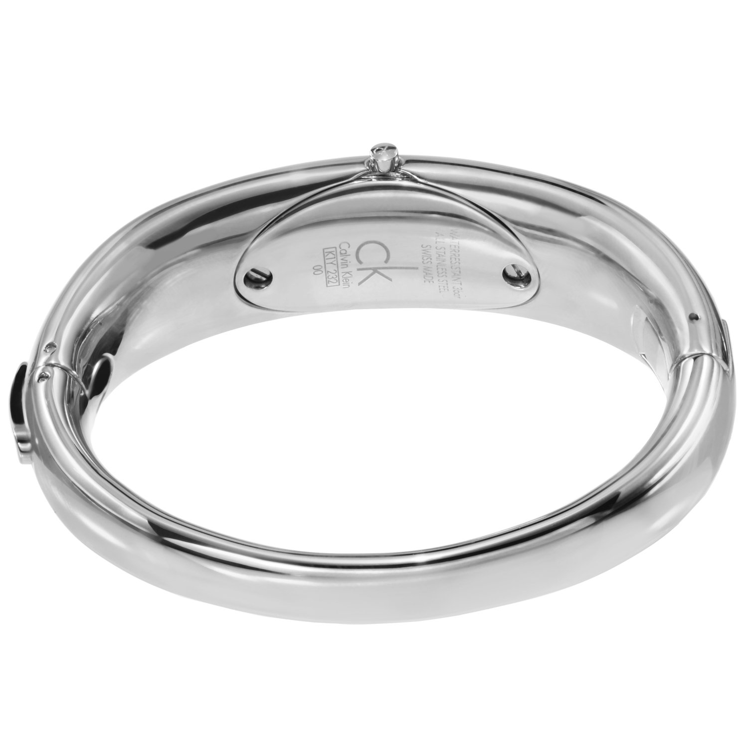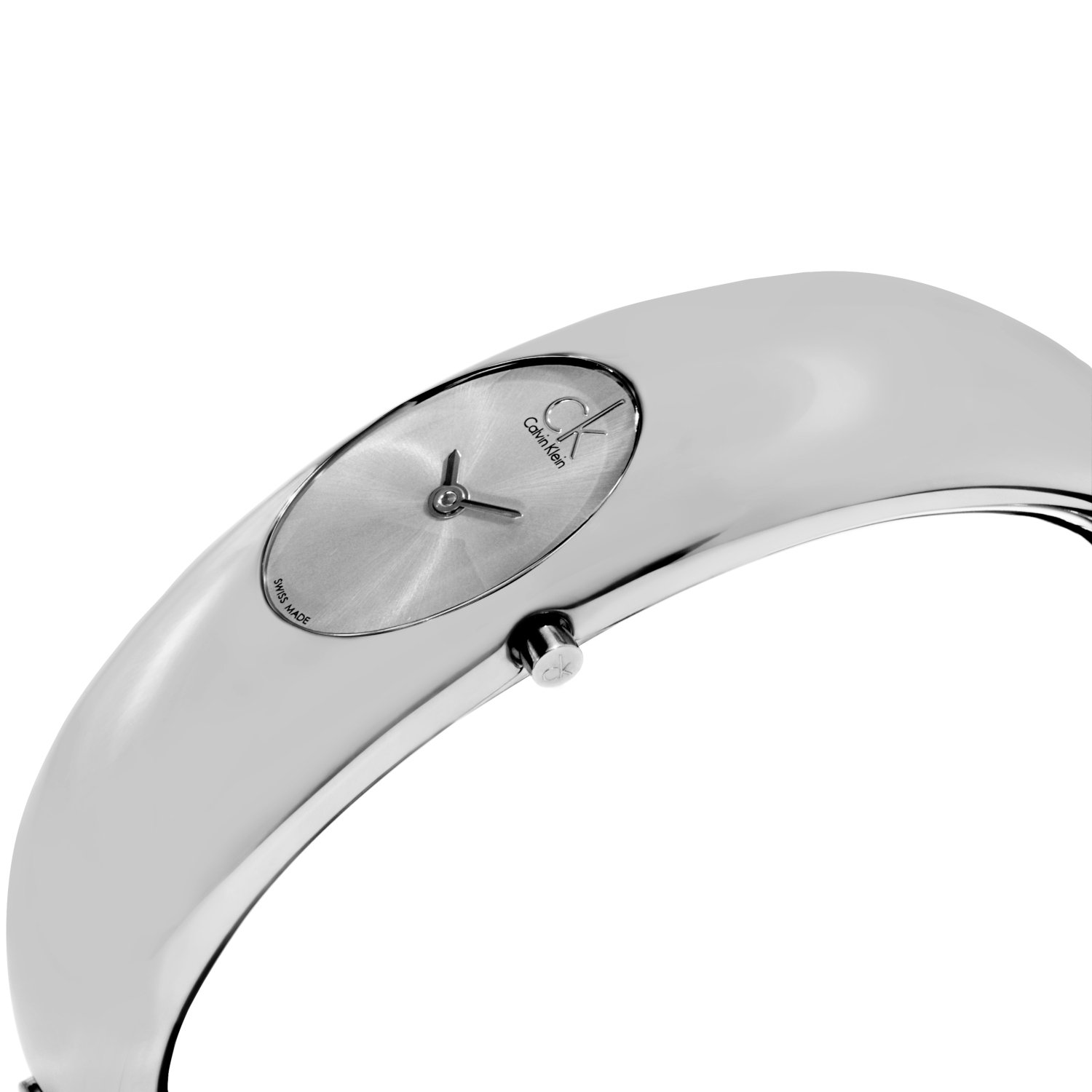 The Calvin Klein Women's K1Y23120 'Exquisite' Silver Dial Stainless Steel Medium Bangle Watch comes complete with a case, box, and paperwork, ensuring that you receive a genuine product. Additionally, it includes a 30-day return policy, allowing you to shop with confidence.