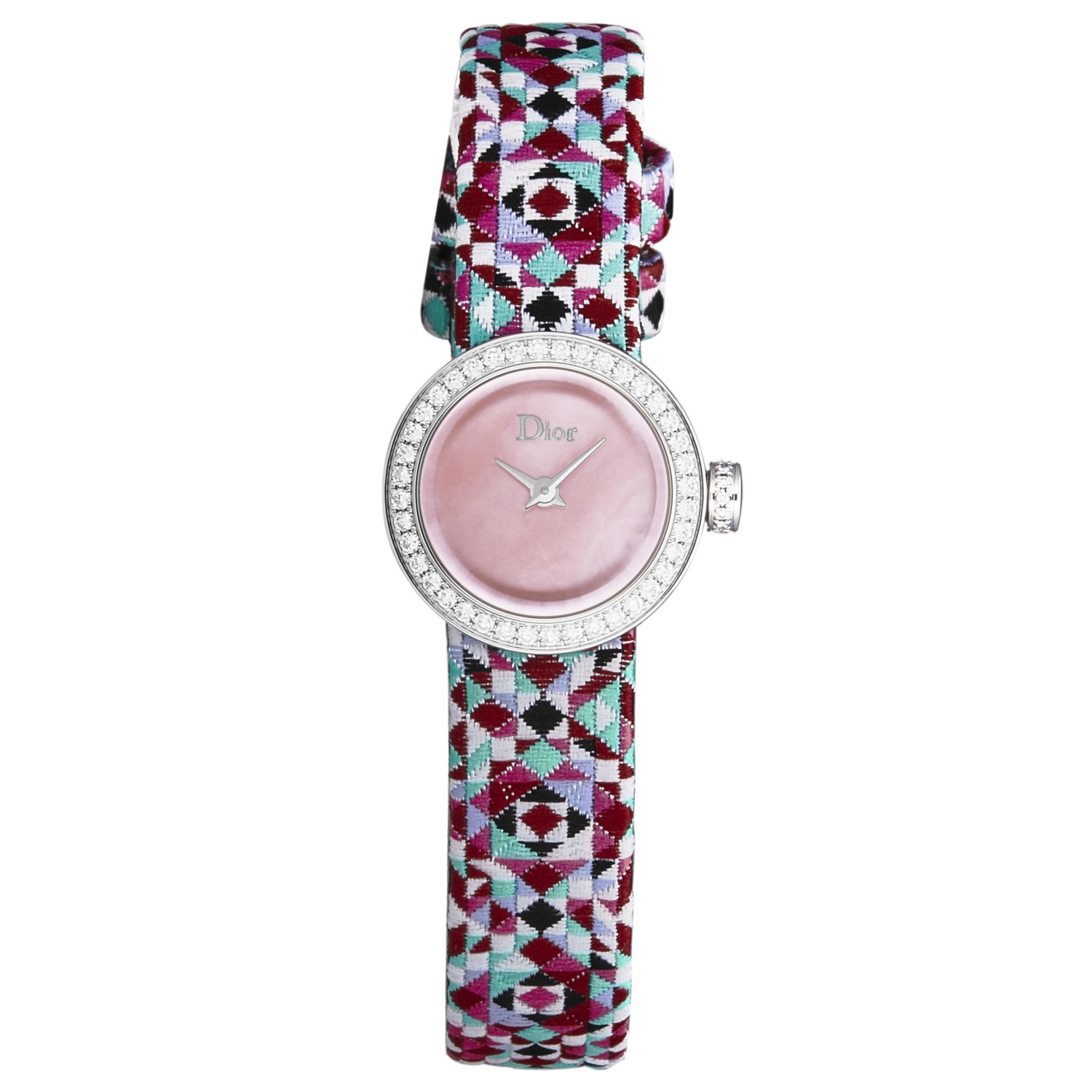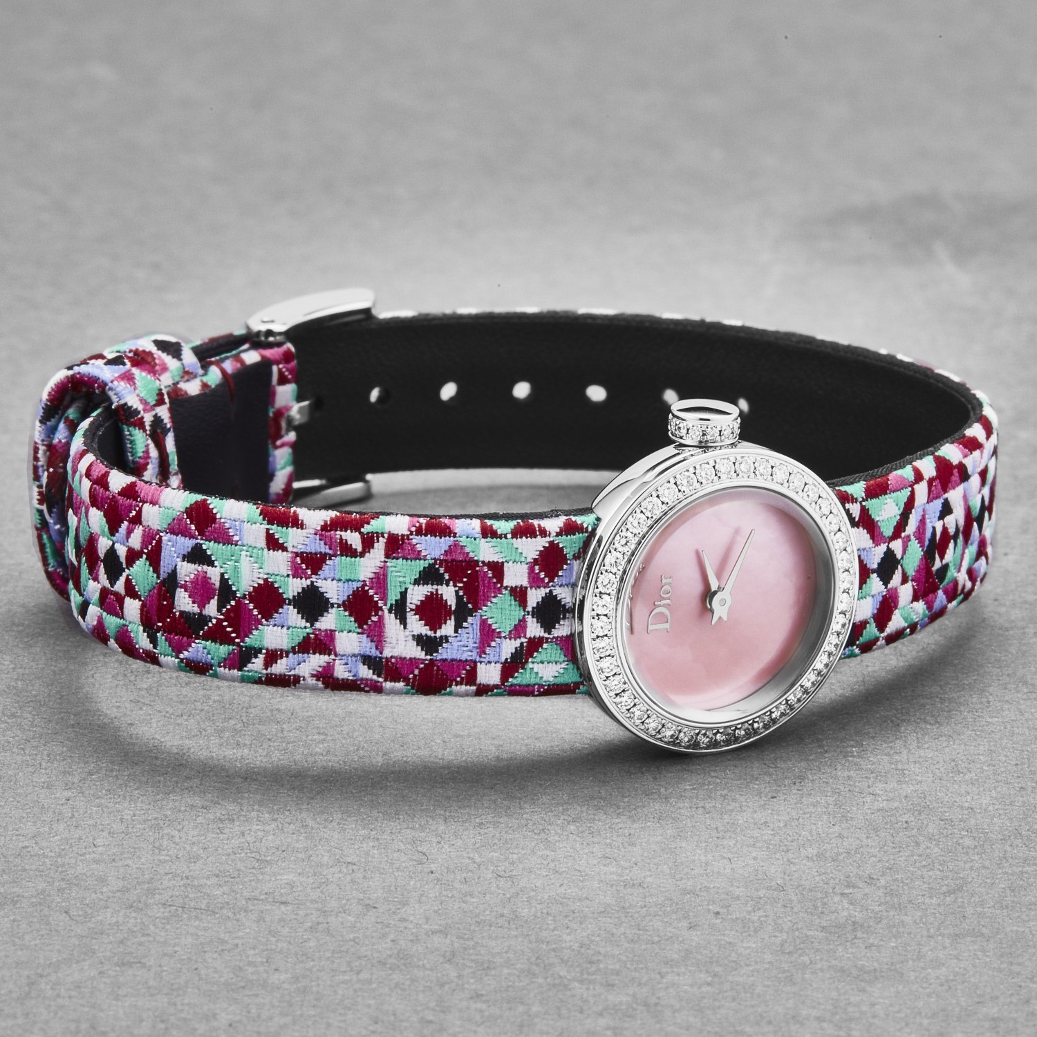 Christian Dior Women's CD040110A026 watch featuring a pink mother of pearl dial, diamond bezel, and multi-color woven strap.