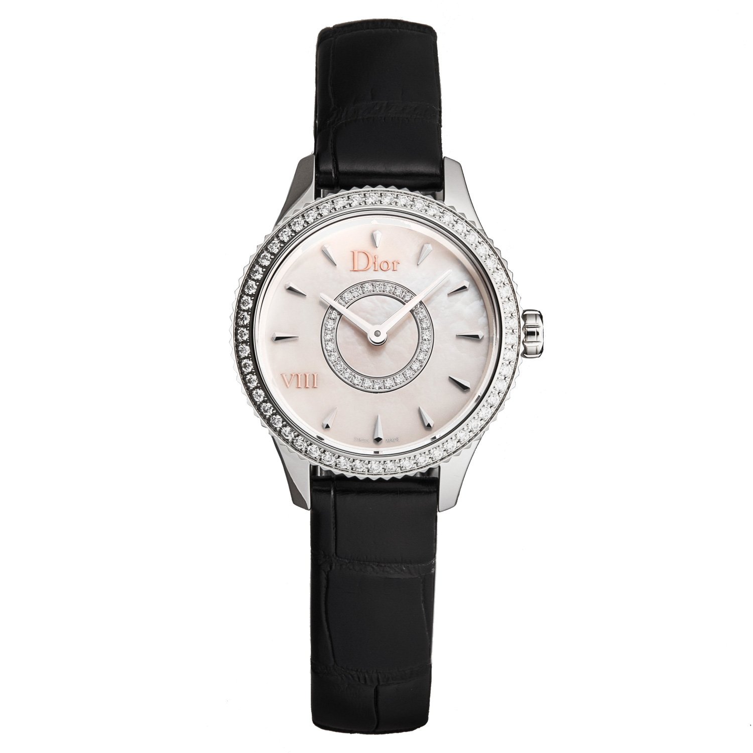 Christian Dior Women's CD151110A001 'Montaigne' watch featuring a mother of pearl diamond dial, diamond bezel, and black leather strap.