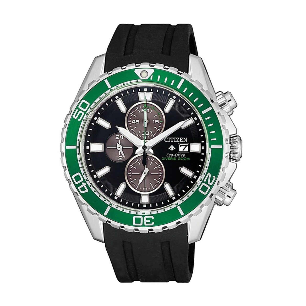 Citizen CA0715-03E Promaster Diver watch featuring a black dial, emerald green bezel, and black rubber strap, ideal for diving.