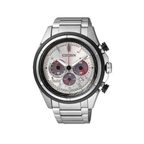 Citizen CA4240-58A Brycen Super Titanium Men's Chronograph Watch with silver dial and red accents.