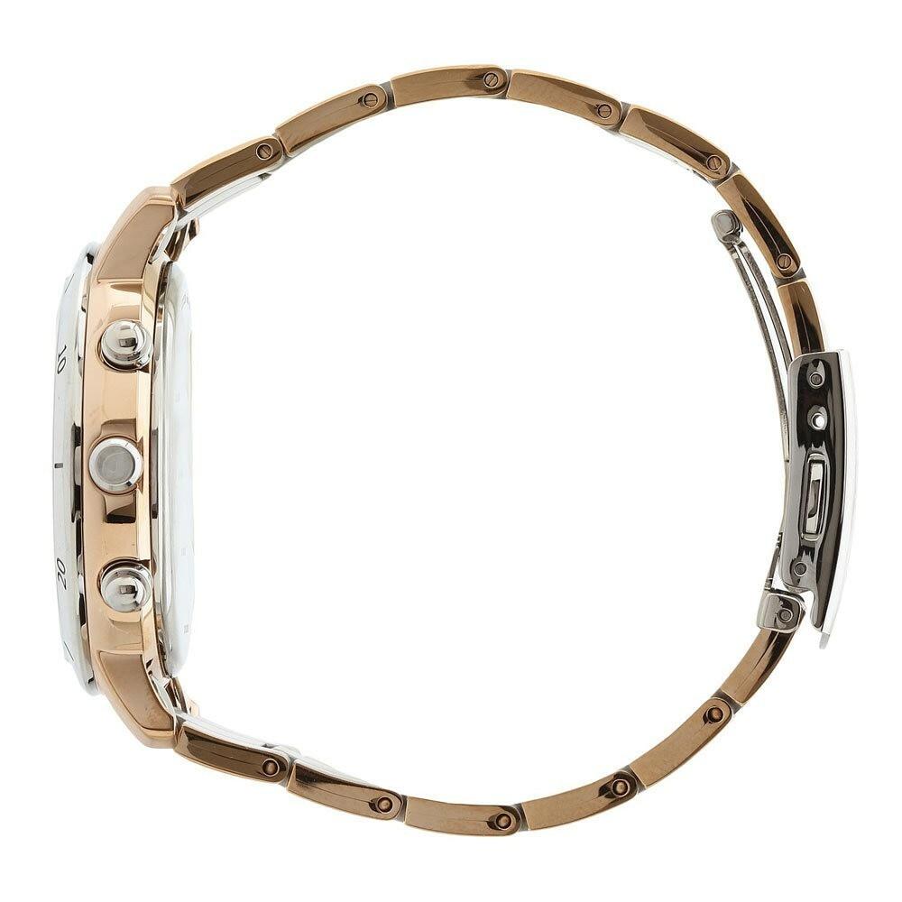 The watch features a stunning rosegold dial that adds a touch of elegance to its overall design. The analog display is easy to read, and the fold-over clasp ensures a secure fit on your wrist. The stationary stainless steel bezel complements the watch's sophisticated look, making it a perfect accessory for any occasion.