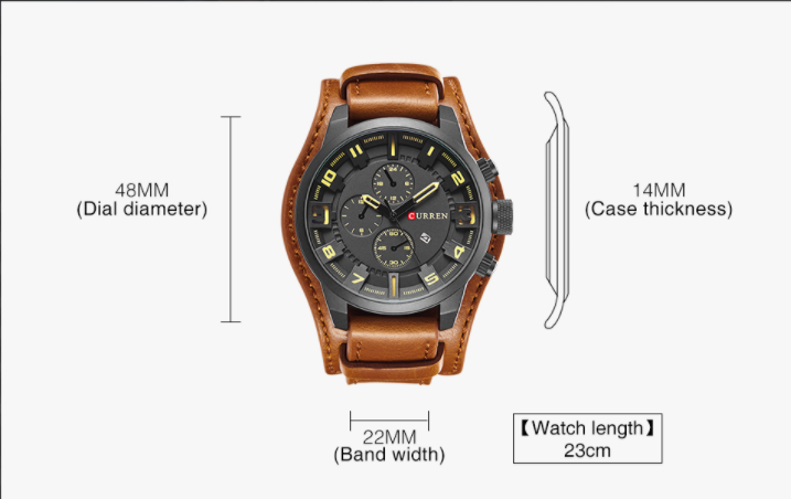 The watch boasts a stylish design with a 46MM dial diameter and a 12MM case thickness, providing a bold yet elegant look on your wrist. The leather strap not only adds to its aesthetic appeal but also ensures comfort during wear. With a bandwidth of 22MM and a band length of 23cm, it fits most wrist sizes comfortably.