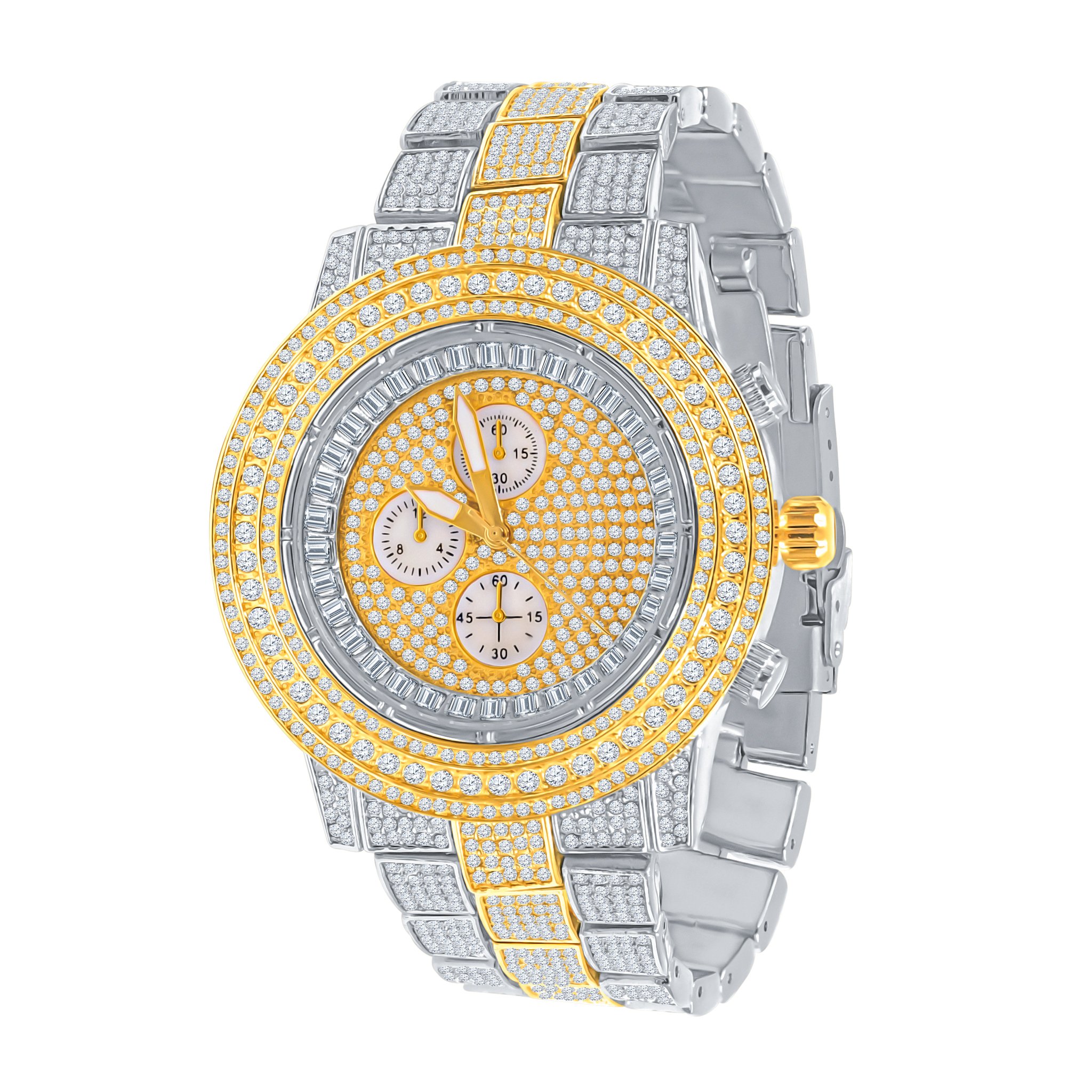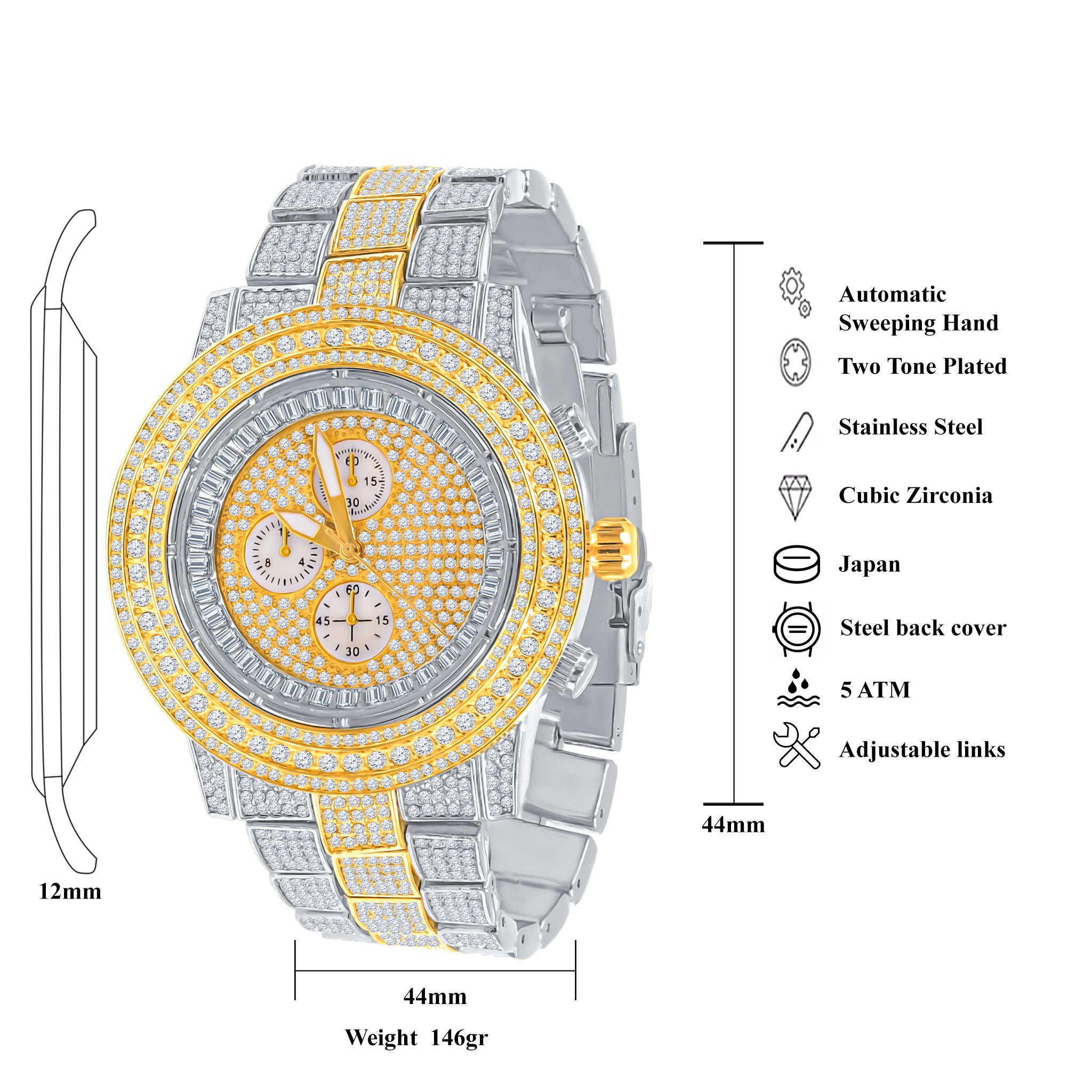 The watch is fully blinged out, featuring a dazzling array of crystal stones that catch the light beautifully. The 12 MM width and 44 MM length make it a substantial piece that commands attention without being overly bulky. The steel back cover adds to its durability, ensuring that it withstands the test of time while maintaining its luxurious appeal.