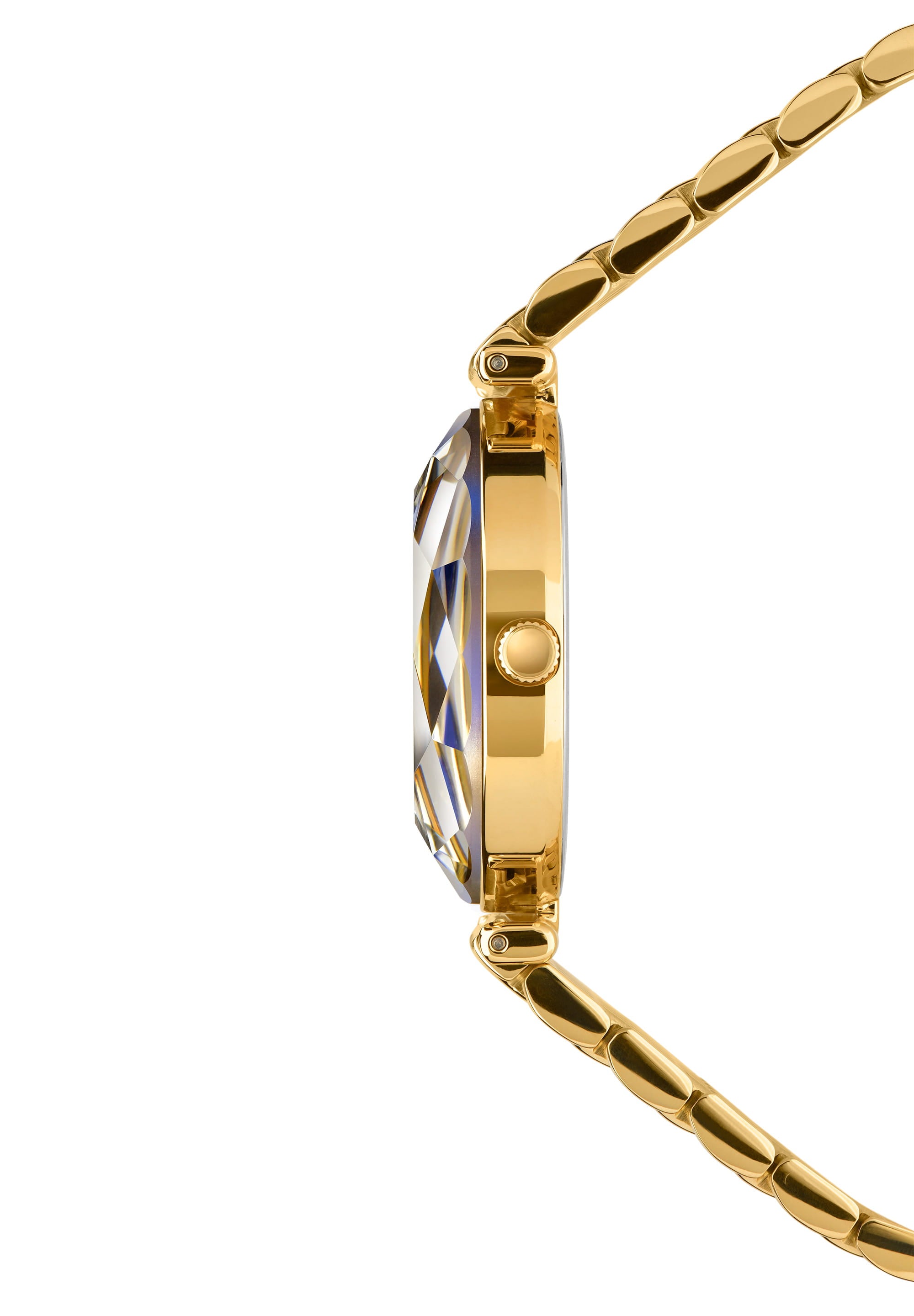 The color scheme of the Facet Brilliant watch is another highlight. The rich blue dial contrasts beautifully with the gold-plated case and bracelet, creating a striking visual appeal. This watch is not just a timepiece; it is a statement accessory that complements any outfit.