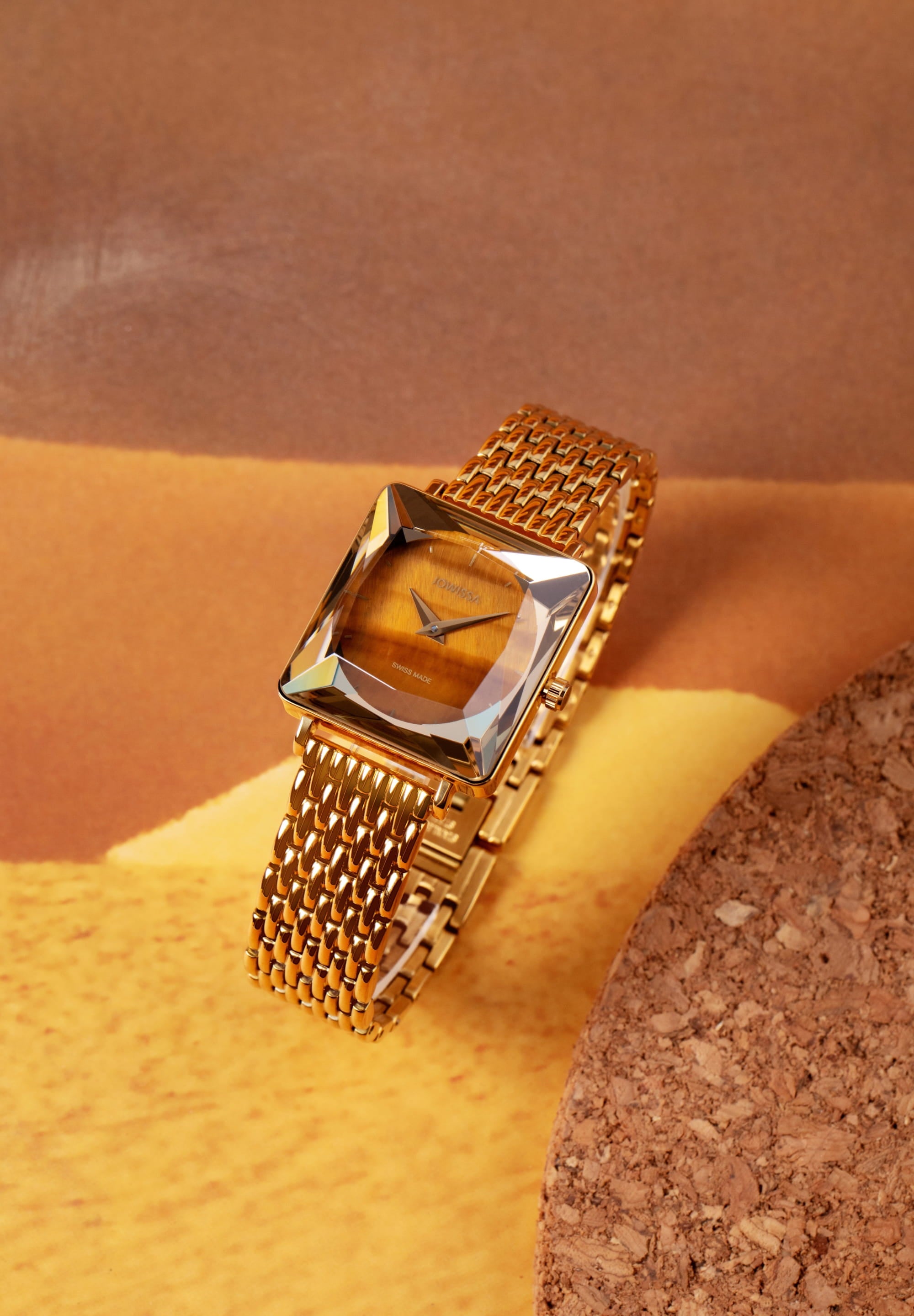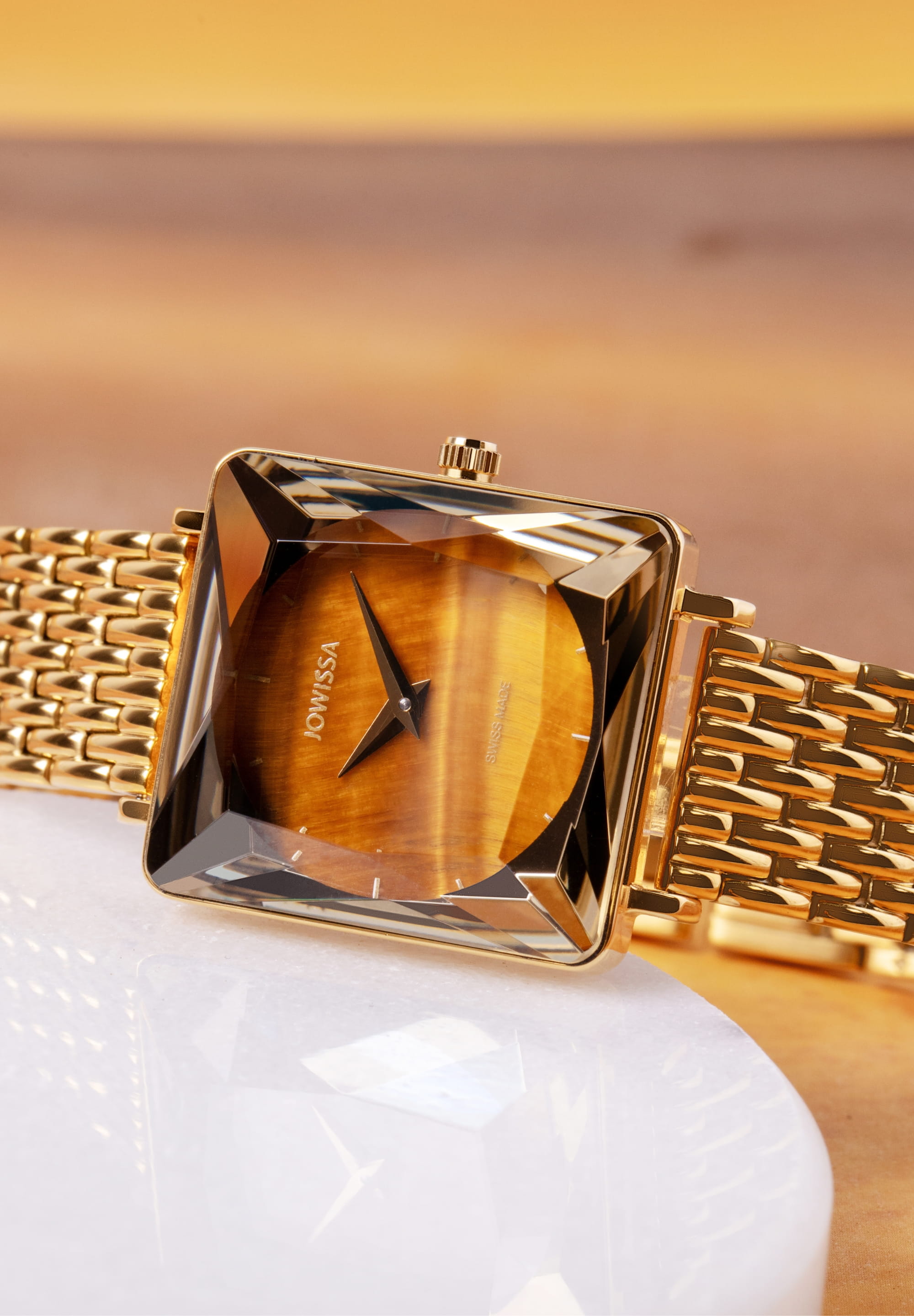 Introducing the Facet Princess Swiss Ladies Watch J8.776.M, a stunning timepiece that embodies classic Swiss craftsmanship and elegance. This exquisite watch features a unique champagne-coloured design, making it a perfect accessory for any occasion. The genuine Tiger's Eye round stone dial is not only visually striking but also adds a touch of sophistication to your wrist. Encased in a sleek square case with rounded corners, this watch is a true statement piece that will elevate your style.