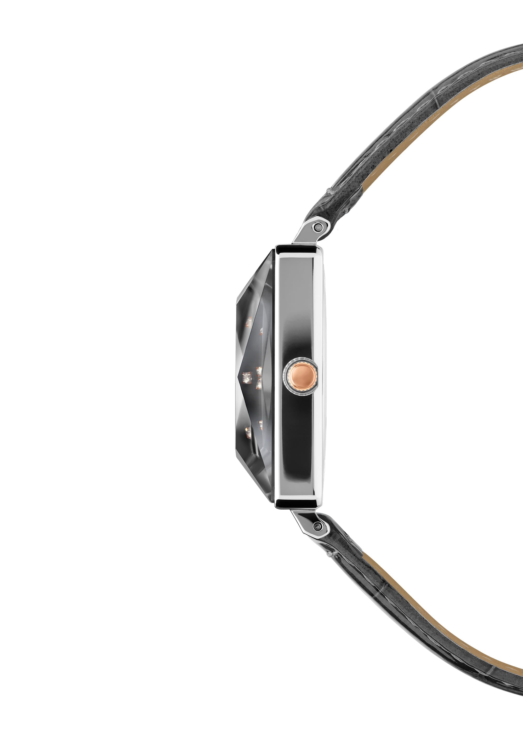 The watch boasts a unique combination of a 25mm rectangular case and a round dial, creating an eye-catching silhouette. The sophisticated grey face is adorned with sparkling rhinestones, serving as hour indices that add a touch of glamour. The diamond Dauphine-style hands glide smoothly over the shiny, sunray dial, ensuring that you can read the time with ease.