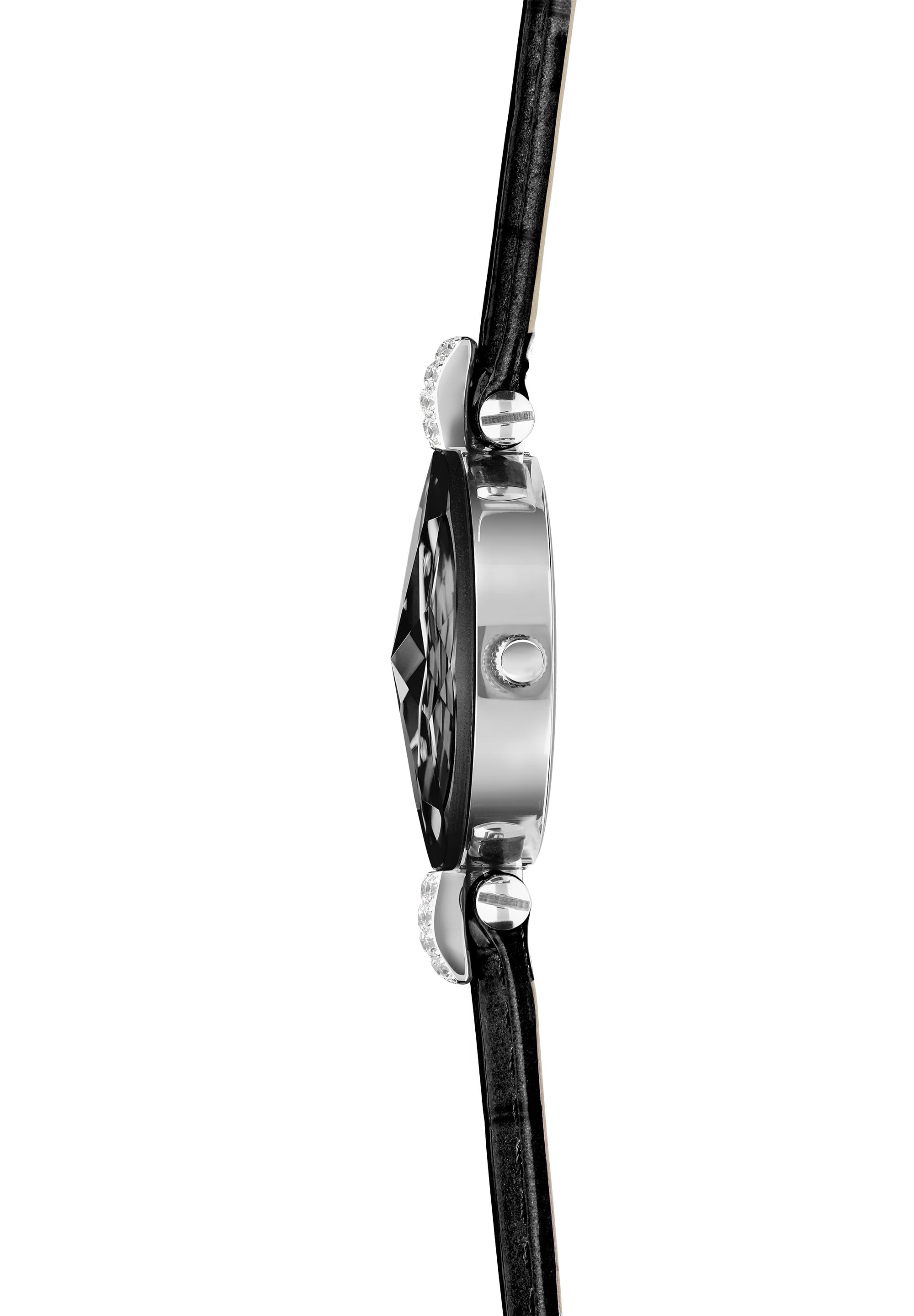 With a case diameter of 25mm, the Facet Strass watch is perfectly sized for a feminine touch. The stainless steel case is adorned with pavé set rhinestones, adding a touch of glamour that catches the light beautifully. The glossy polished surface of the case enhances its luxurious appearance, making it a standout piece in any jewelry collection.