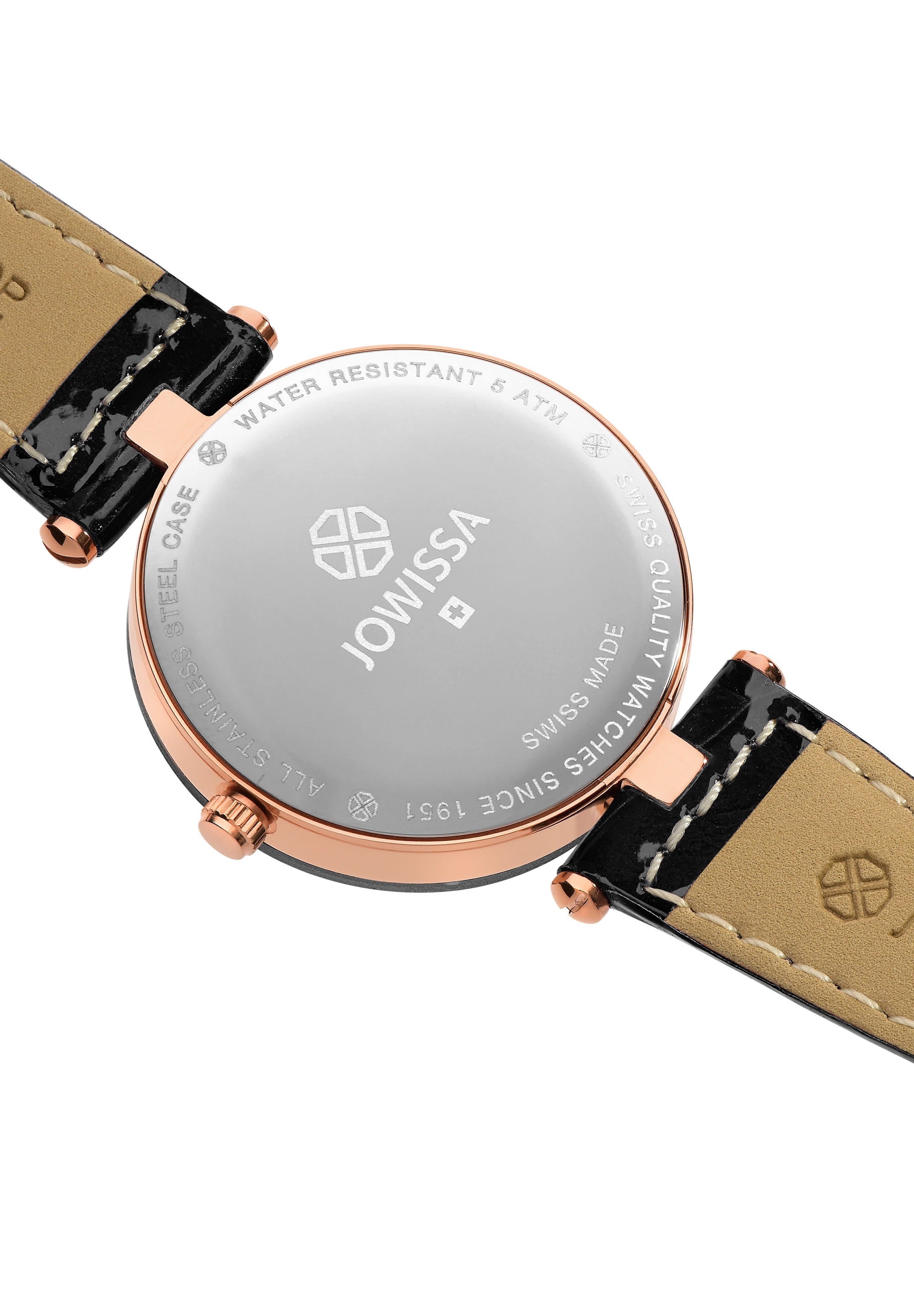 Facet Strass Swiss Ladies Watch J5.650.M featuring a black dial, rose-gold accents, and rhinestones, with a glossy black crocodile leather strap.