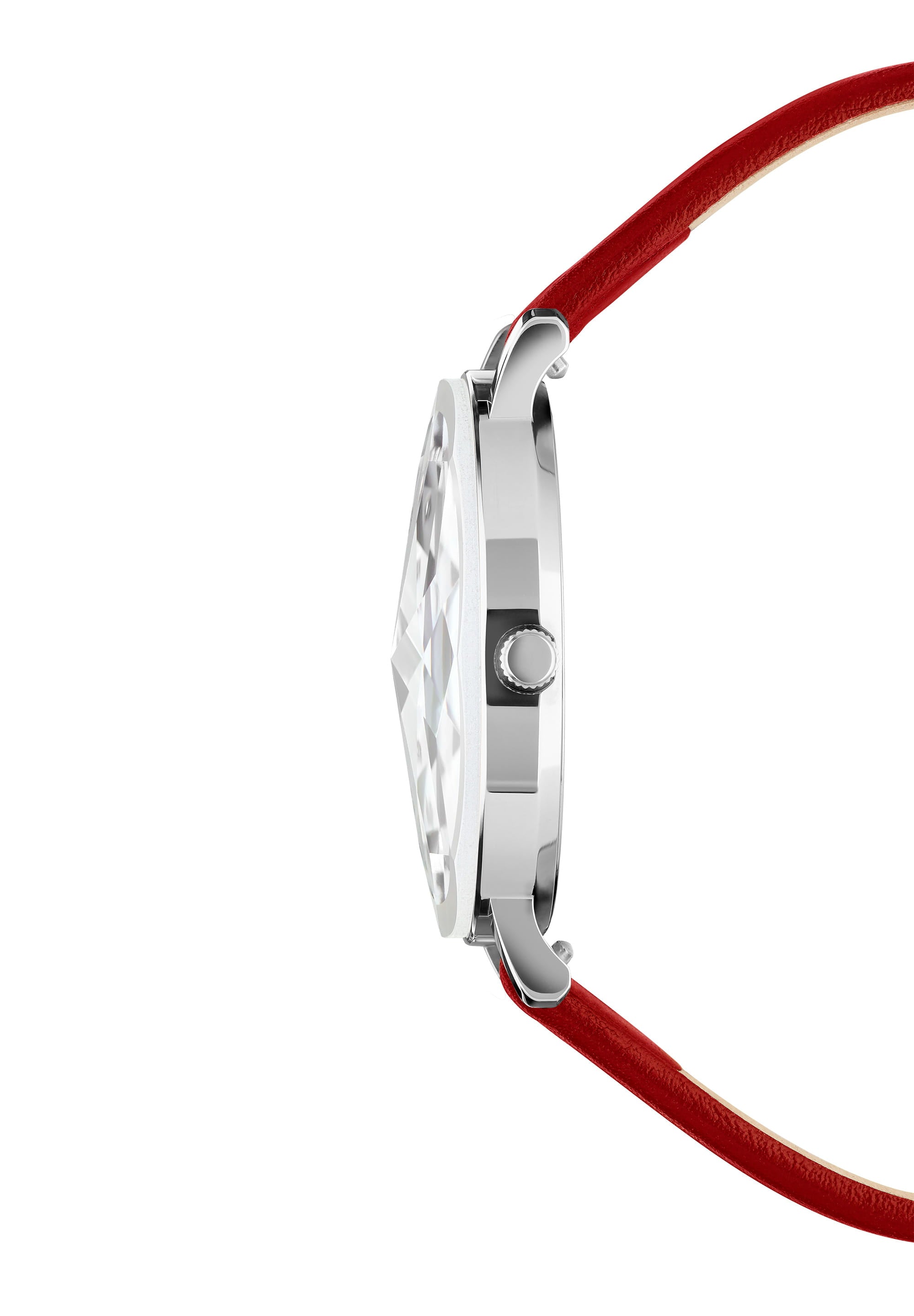 The Facet Swiss Ladies Watch J5.602.L is a perfect blend of elegance and functionality, designed for the modern woman who appreciates both style and precision. With a 35mm diameter, this watch is not only bold but also beautifully crafted to enhance any outfit. The watch features a stunning white enamel dial adorned with 12 applied rhinestones that serve as hour indices, adding a touch of sparkle to your wrist. The diamond, Dauphine-style hands glide gracefully over the dial, ensuring that you can read the time with ease.