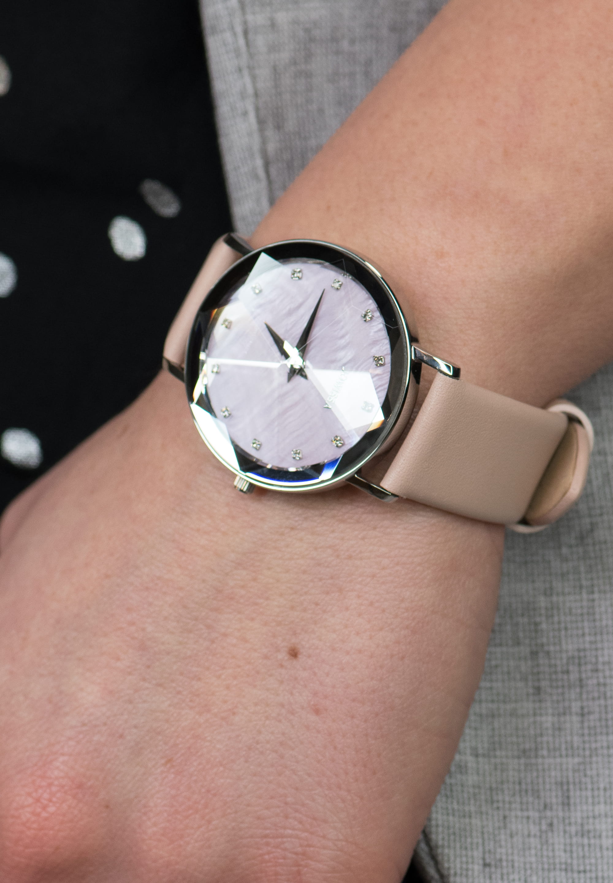 The watch features a beautiful mother of pearl dial adorned with cut glass and sparkling crystals. The dial is accentuated by 12 applied rhinestones that serve as hour indices, providing a luxurious touch while ensuring easy readability. The diamond, Dauphine-style hands glide gracefully over the dial, adding to the watch's sophisticated appearance.