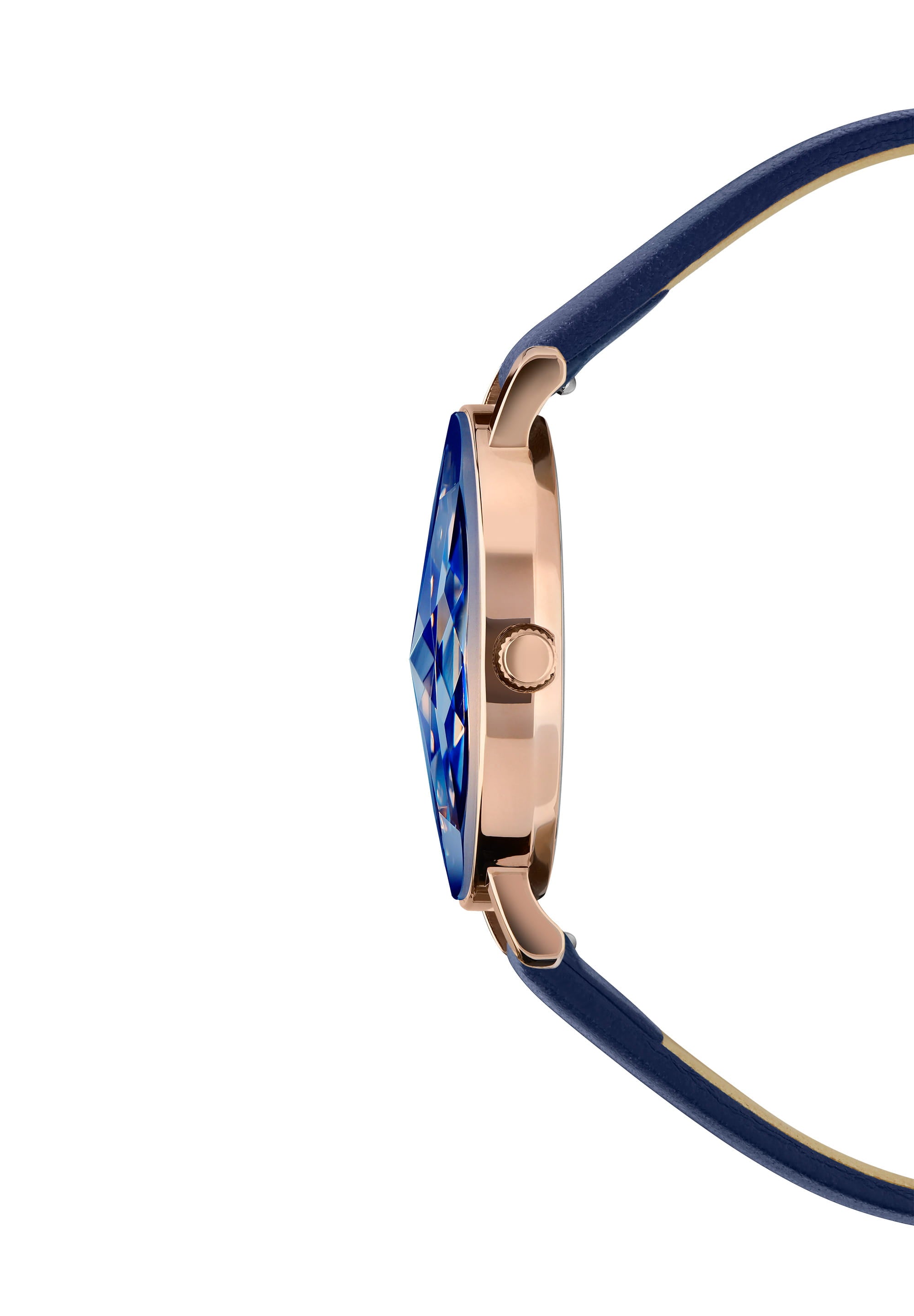 The Facet Swiss Ladies Watch features a 30mm wide diamond-cut faceted crystal that sparkles brilliantly, reminiscent of a colorful jewel. The azure blue sunray dial adds a touch of sophistication, making it an ideal choice for both casual and formal occasions. The watch is designed to impress, ensuring that you stand out in any crowd.