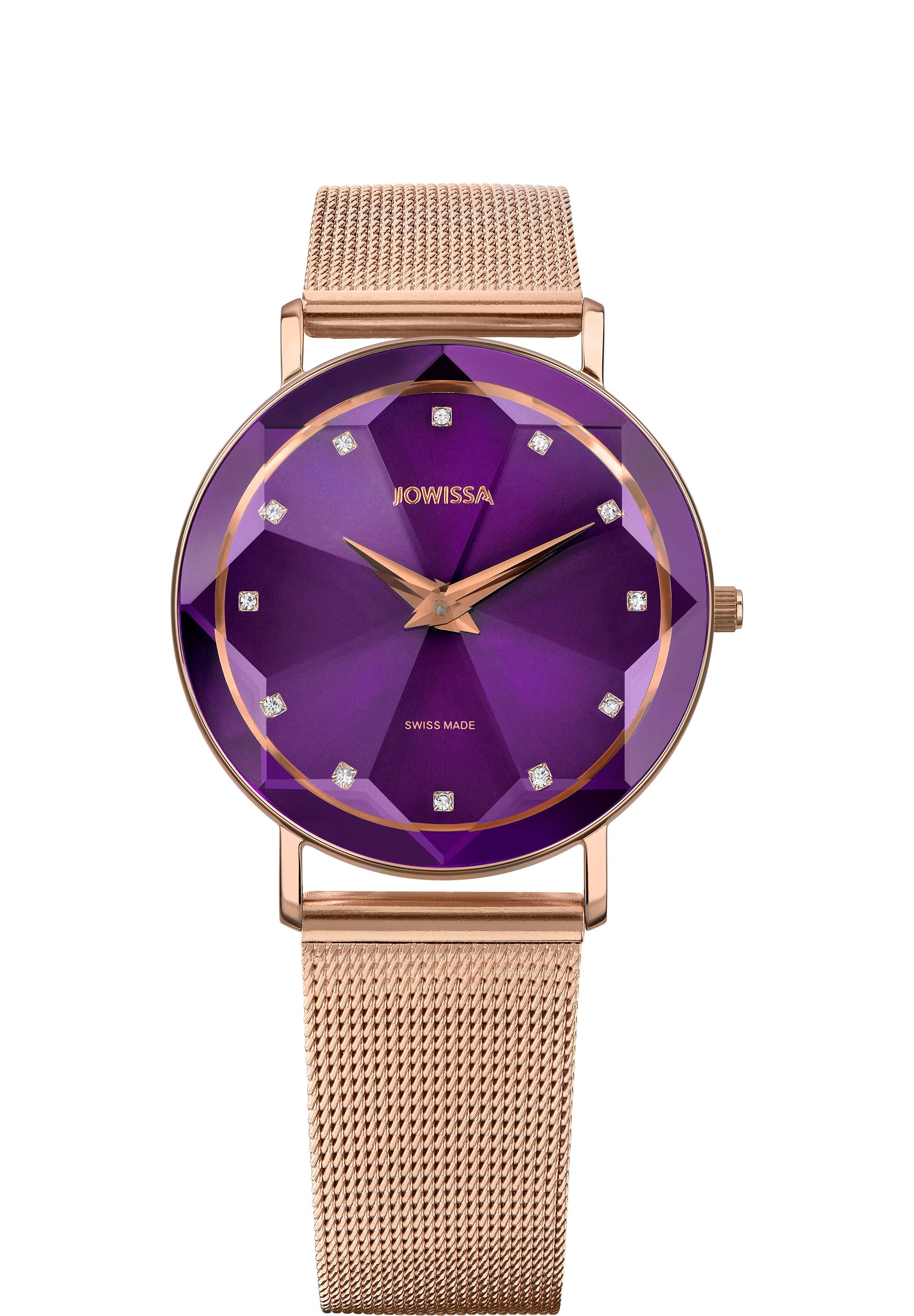 The Facet Swiss Ladies Watch J5.612.L is a stunning timepiece that combines elegance and functionality. With its rich purple sunray dial, this watch is designed to make a statement. The polished 35mm stainless steel case adds a touch of sophistication, while the diamond-cut crystal enhances its luxurious appeal. This watch is perfect for any occasion, whether you're dressing up for a special event or looking to add a touch of glamour to your everyday outfit.