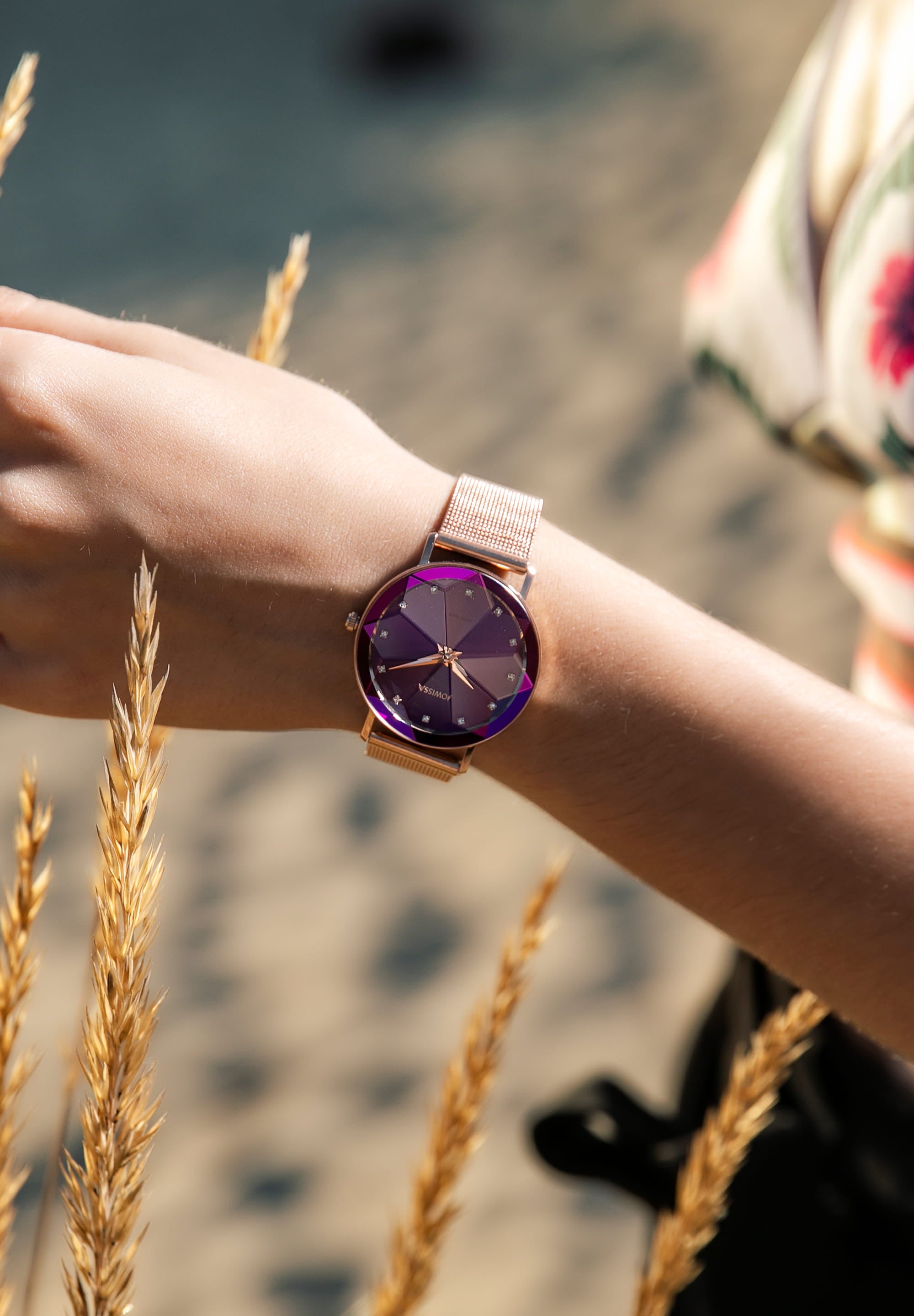 The shiny sunray dial is adorned with 12 applied rhinestones as hour indices, providing a beautiful contrast against the purple background. The diamond Dauphine-style hands glide smoothly across the dial, making it easy to read the time at a glance. The watch case is made from high-quality stainless steel, ensuring durability and longevity.
