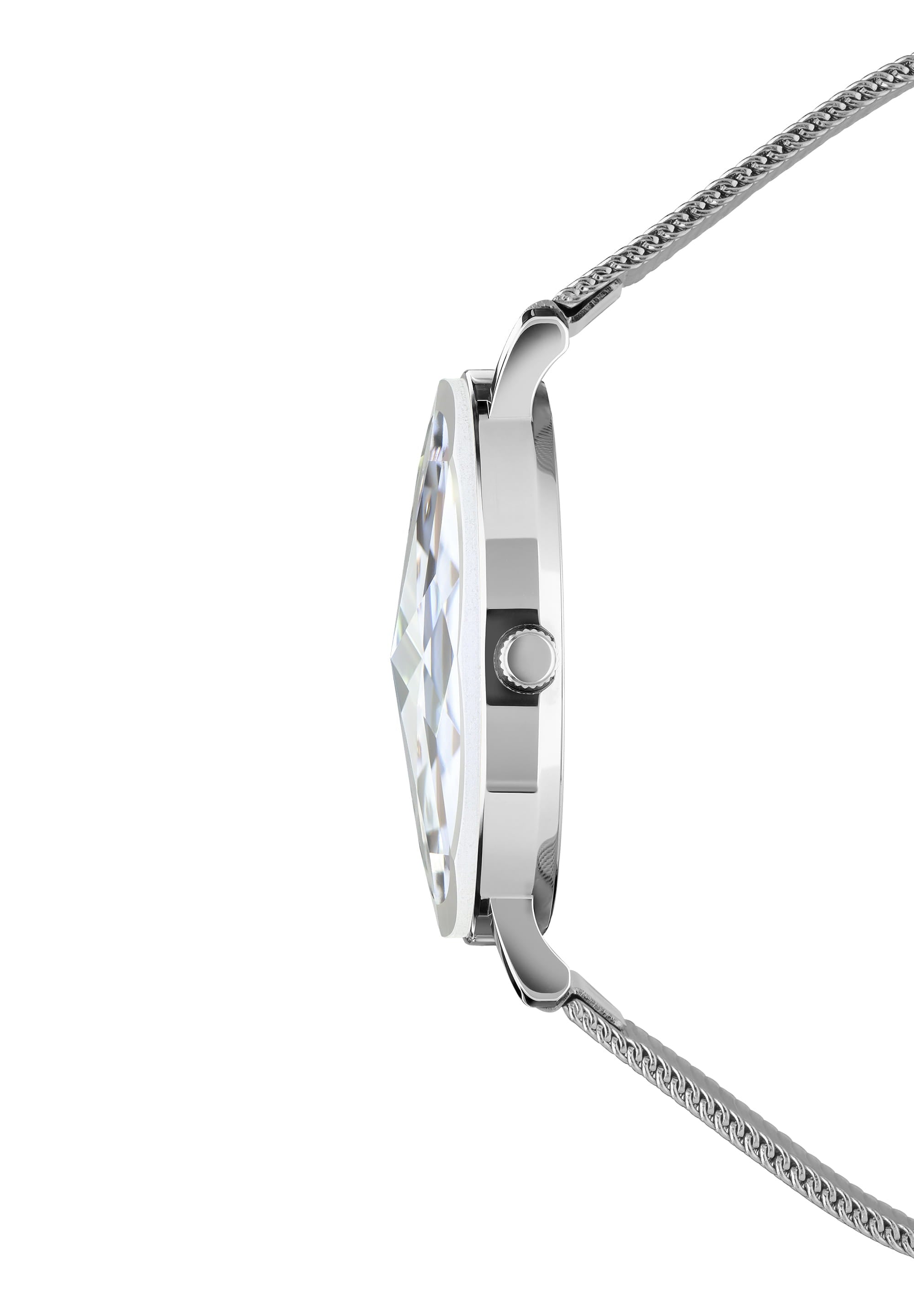 The Facet Swiss Ladies Watch features a stainless steel mesh band that is not only stylish but also continuously adjustable. This allows for a perfect fit on wrist circumferences ranging from 175 to 220 mm. The stainless steel buckle is laser-engraved with the logo, adding a touch of sophistication to the overall design. Additionally, the band is interchangeable with a quick-release mechanism, allowing you to customize your watch according to your style.