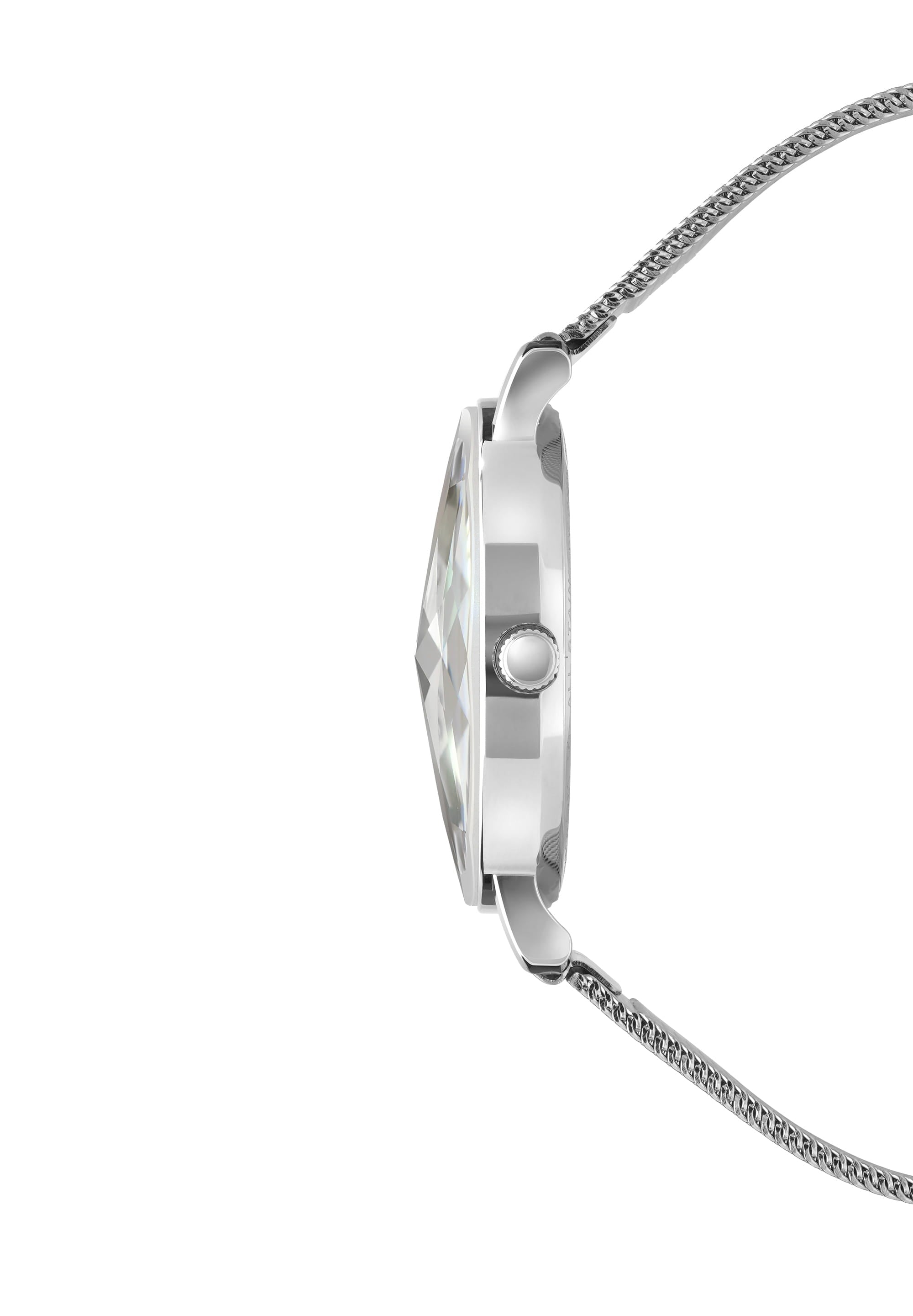 The Facet Swiss Ladies Watch J5.668.M features a stainless steel mesh band that is not only stylish but also continuously adjustable. This ensures a perfect fit for wrist circumferences ranging from 150mm to 200mm. The stainless steel buckle is laser-engraved with the brand's logo, adding a touch of sophistication to the design.