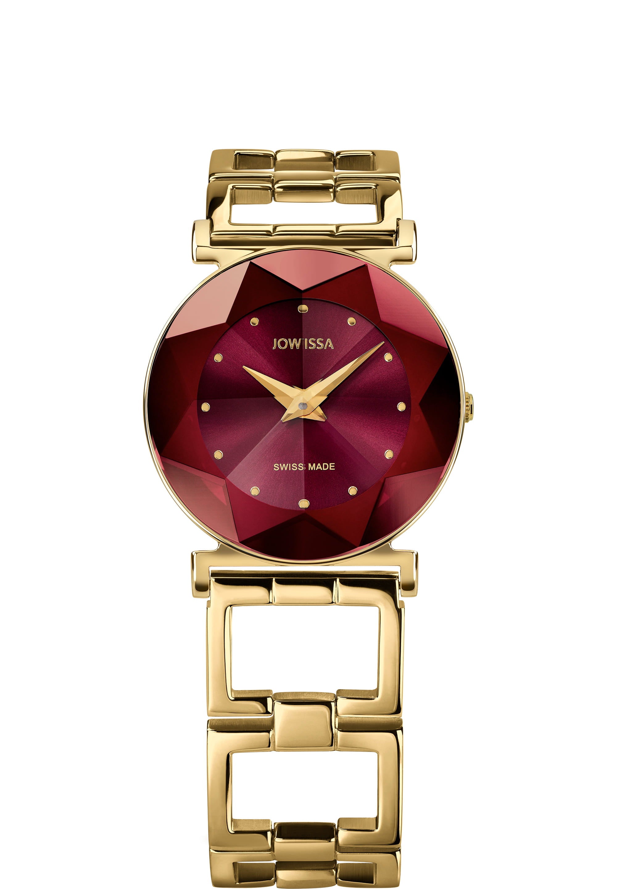 The Facet Swiss Ladies Watch J5.852.M is a stunning timepiece that combines elegance with functionality. This exquisite watch showcases a vibrant burst of color with its extravagant burgundy sunray dial, making it a perfect accessory for any outfit. The watch features a 30mm stainless steel casing that is both durable and stylish, ensuring it stands out on your wrist.