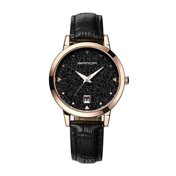 Fashionable female quartz watch with a leather strap, featuring a stylish dial and durable design.