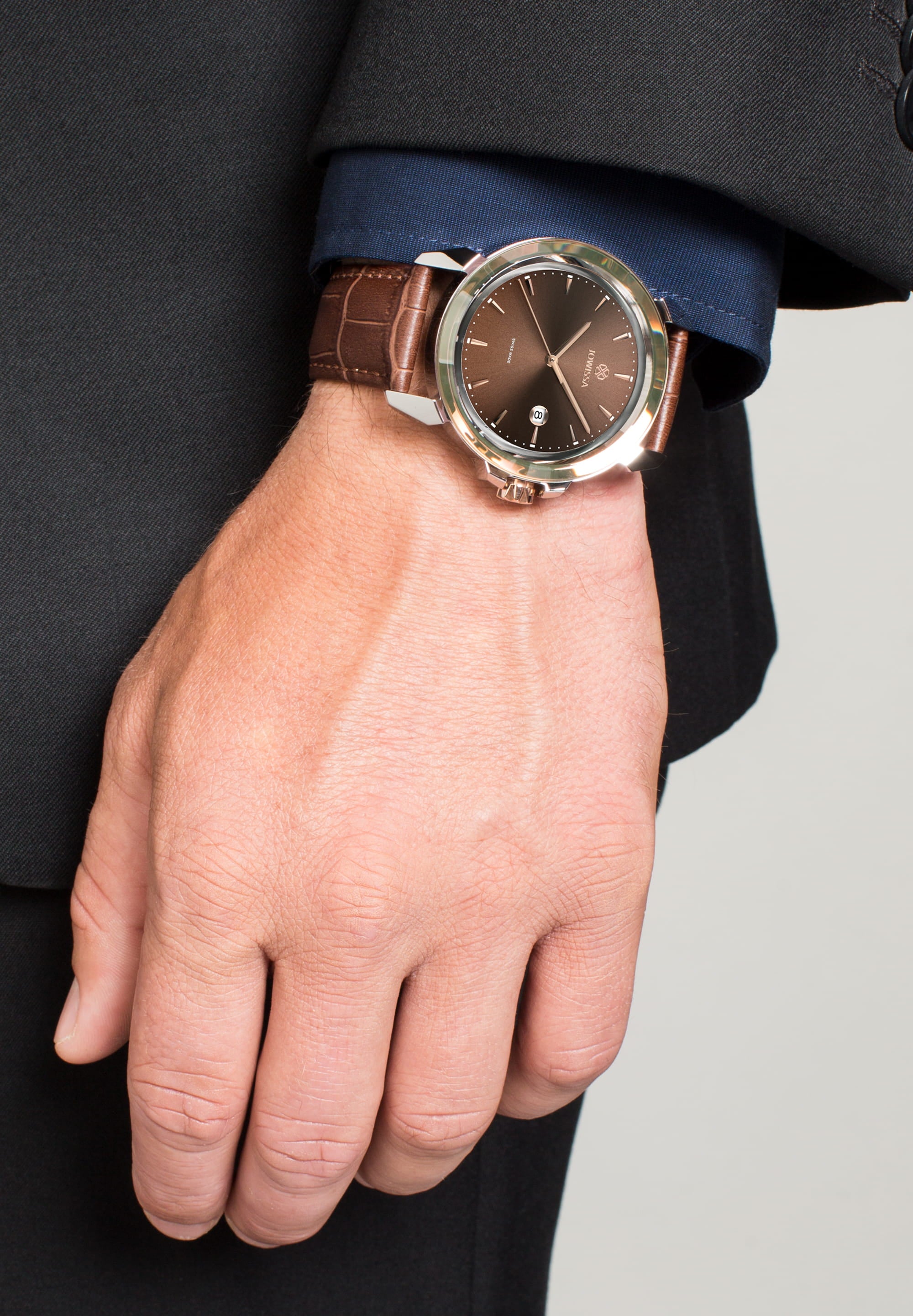 Introducing the LeWy 3 Swiss Men's Watch J4.240.L, a perfect blend of style and functionality. This exquisite timepiece is designed for the modern man who appreciates quality and elegance. With its striking 42mm diameter and sable-brown dial, this watch is sure to make a statement on your wrist, whether you're at the office or out for a casual evening.