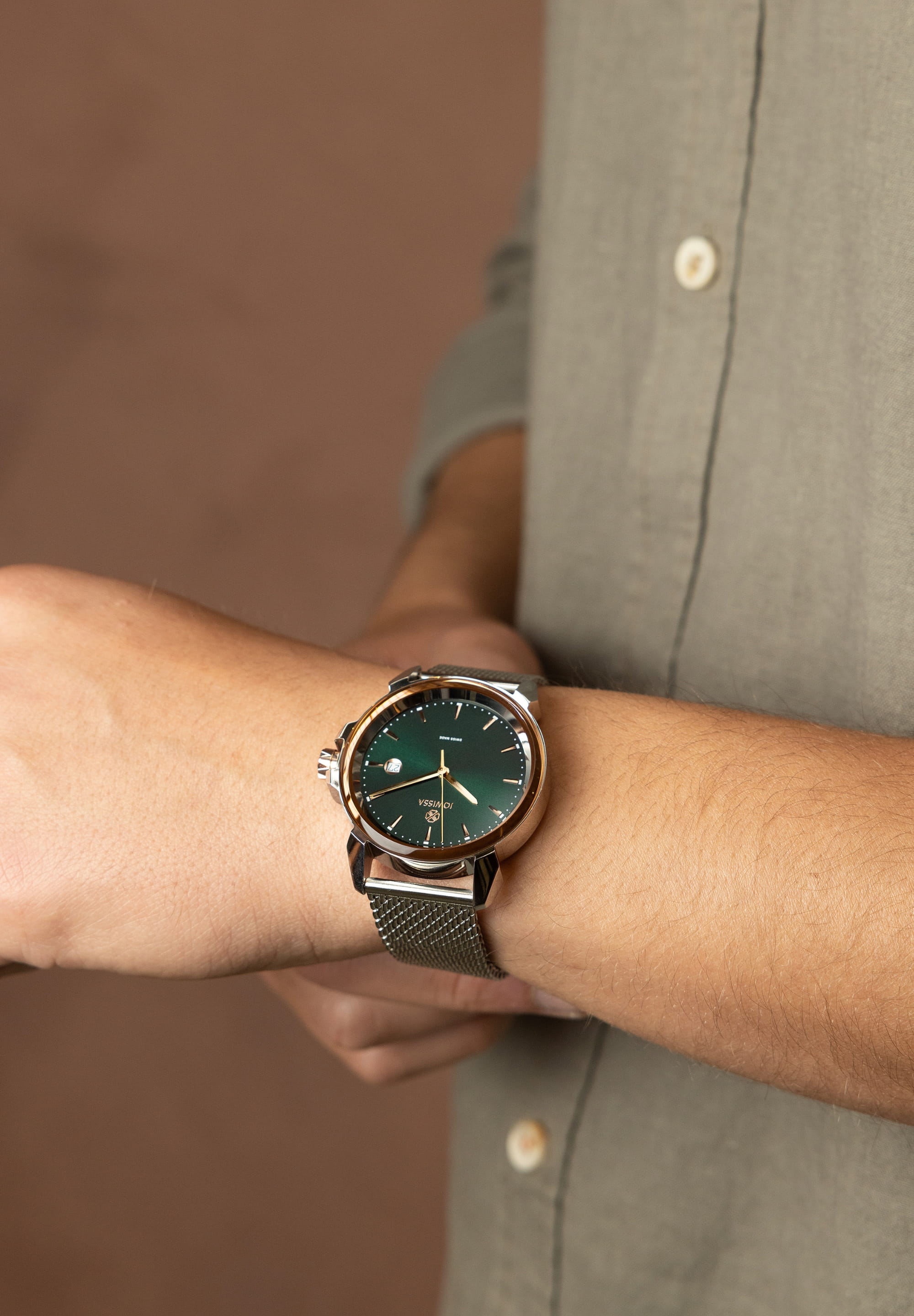 The LeWy 3 Swiss Men's Watch J4.467.L is a remarkable timepiece that combines style, functionality, and Swiss craftsmanship. Designed for the modern man, this watch features a striking green dial that catches the eye, complemented by elegant rose-gold details. The robust glass with a polished edge adds to its sophisticated look, making it a perfect accessory for both casual and formal occasions.
