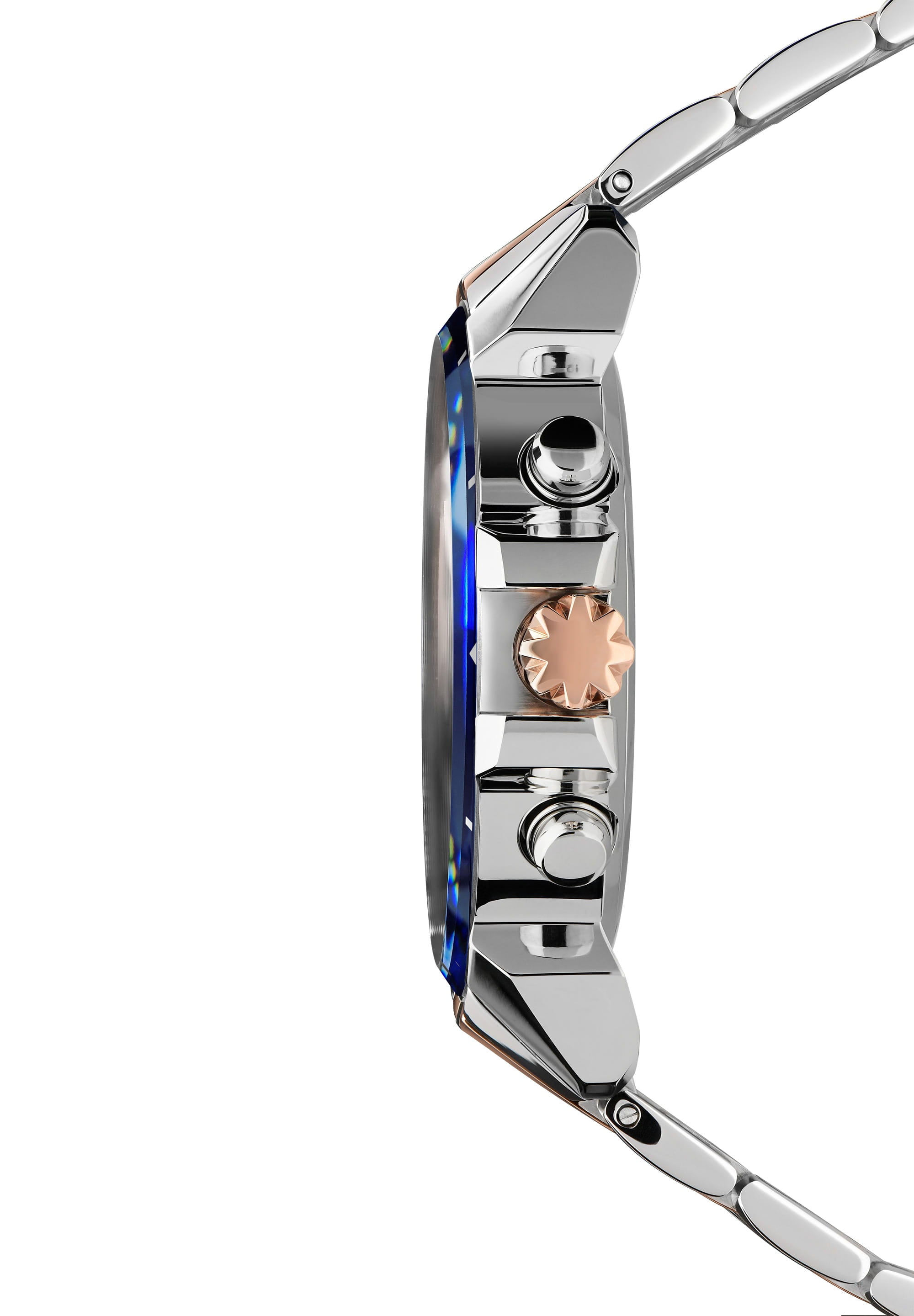 The watch features a polished blue bezel that complements the blue dial beautifully. The shale look of the dial is enhanced with sub-dials for the chronograph function, making it not only stylish but also practical. The applied baton hour indices and printed minutes provide clear readability, while the flame-shaped hands are both polished and luminescent, ensuring visibility in low light conditions.