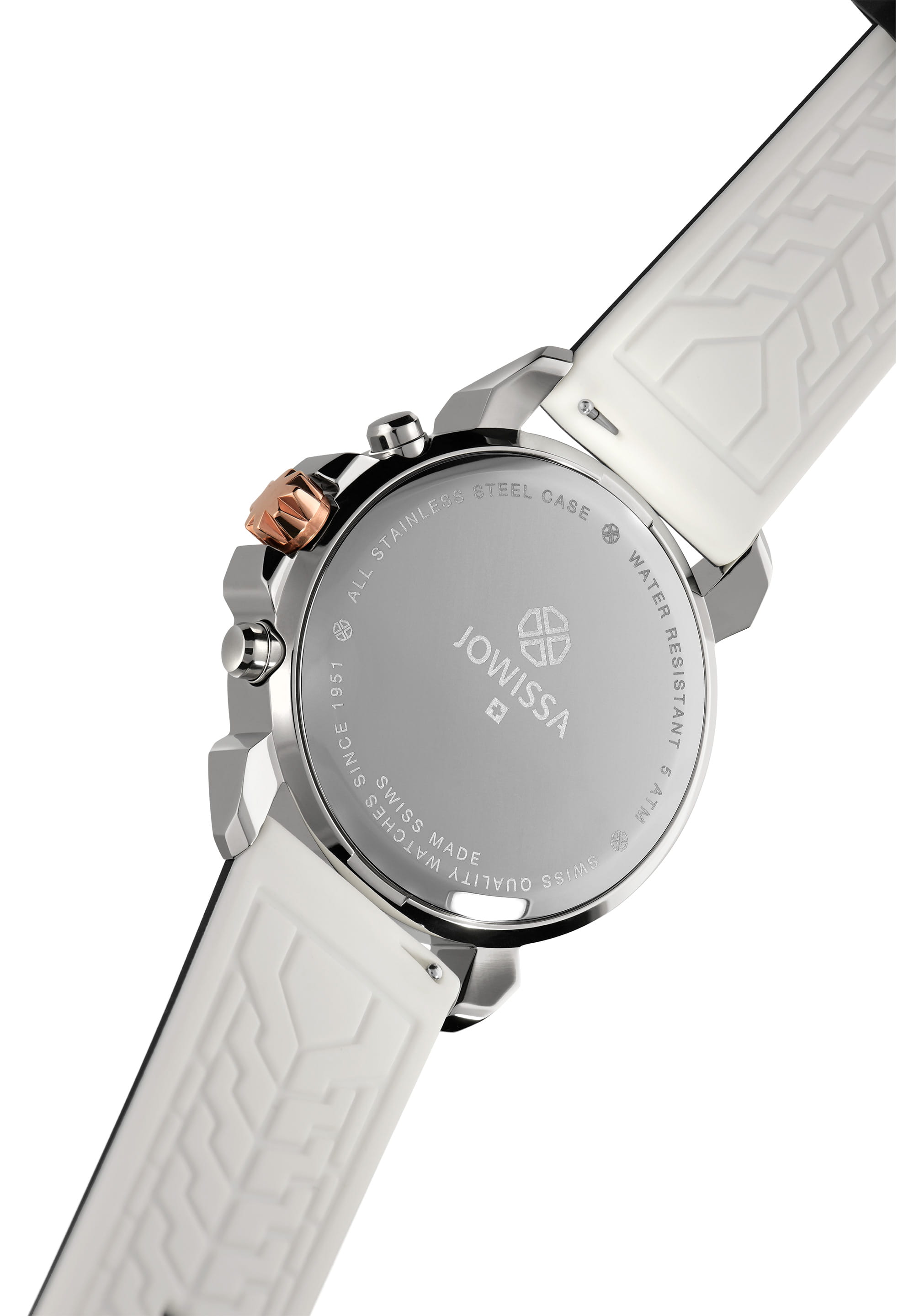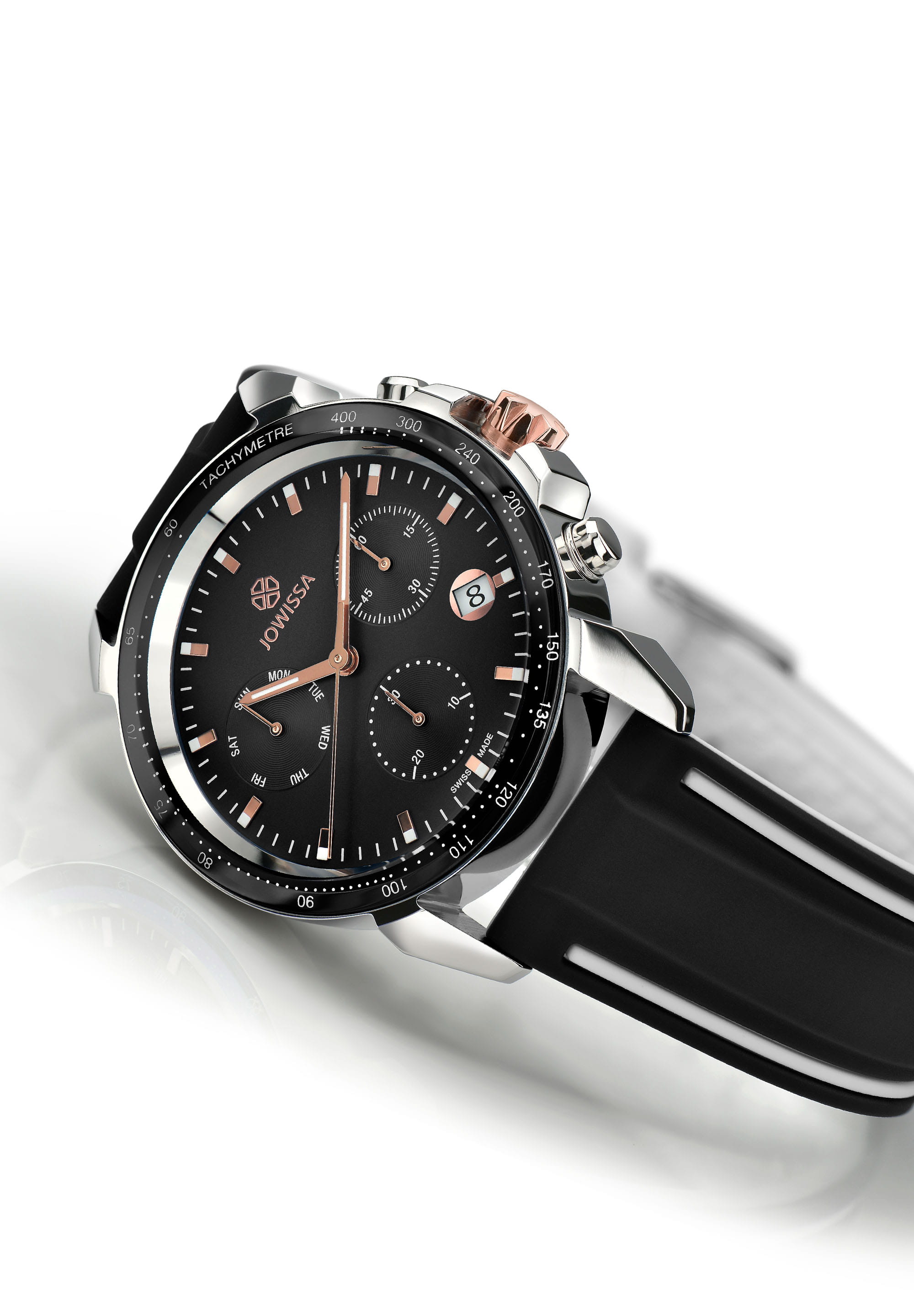 The LeWy 9 Swiss Men's Watch J7.104.L is the perfect blend of style and functionality, designed for the modern man who appreciates both aesthetics and performance. This sportier chronograph features a contemporary look with a striking black silicone bracelet that is refreshed with white edging, making it a fashionable accessory for any occasion.