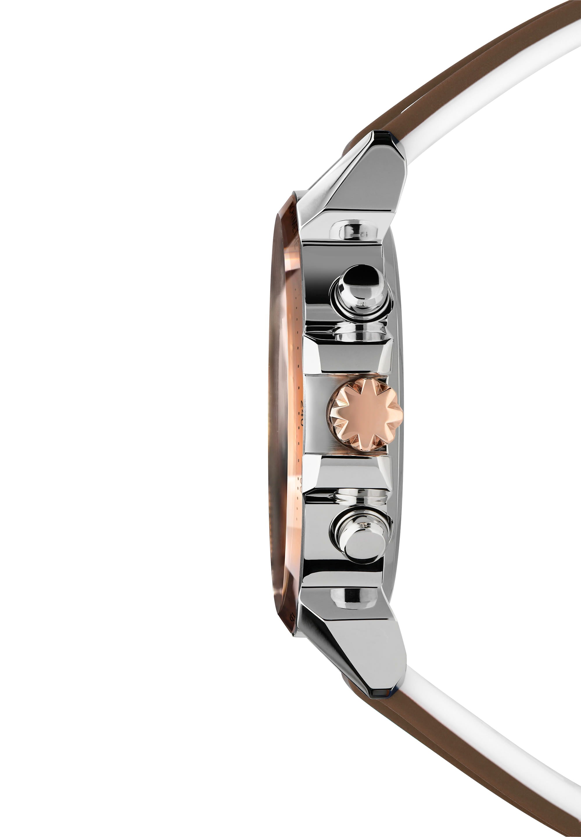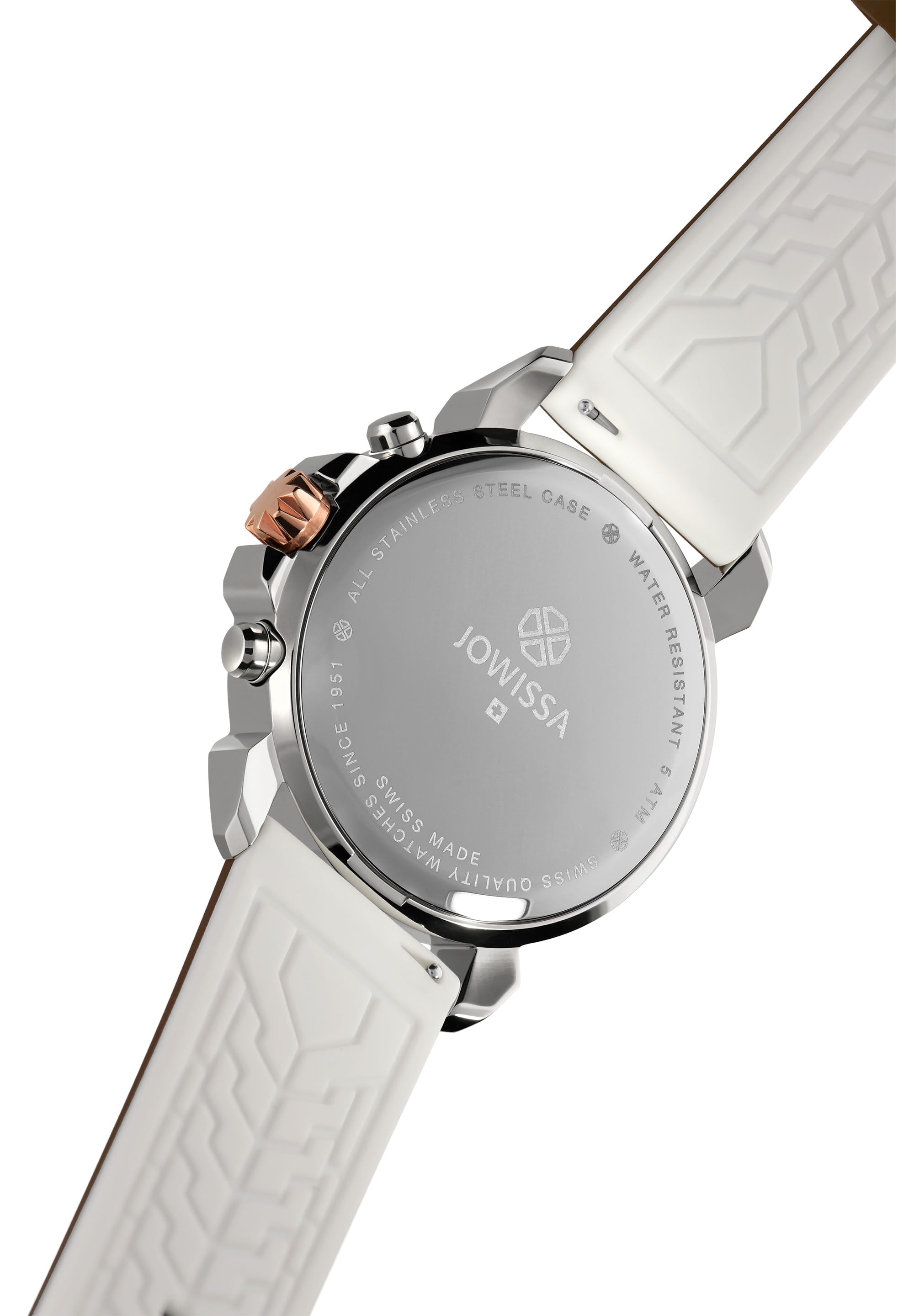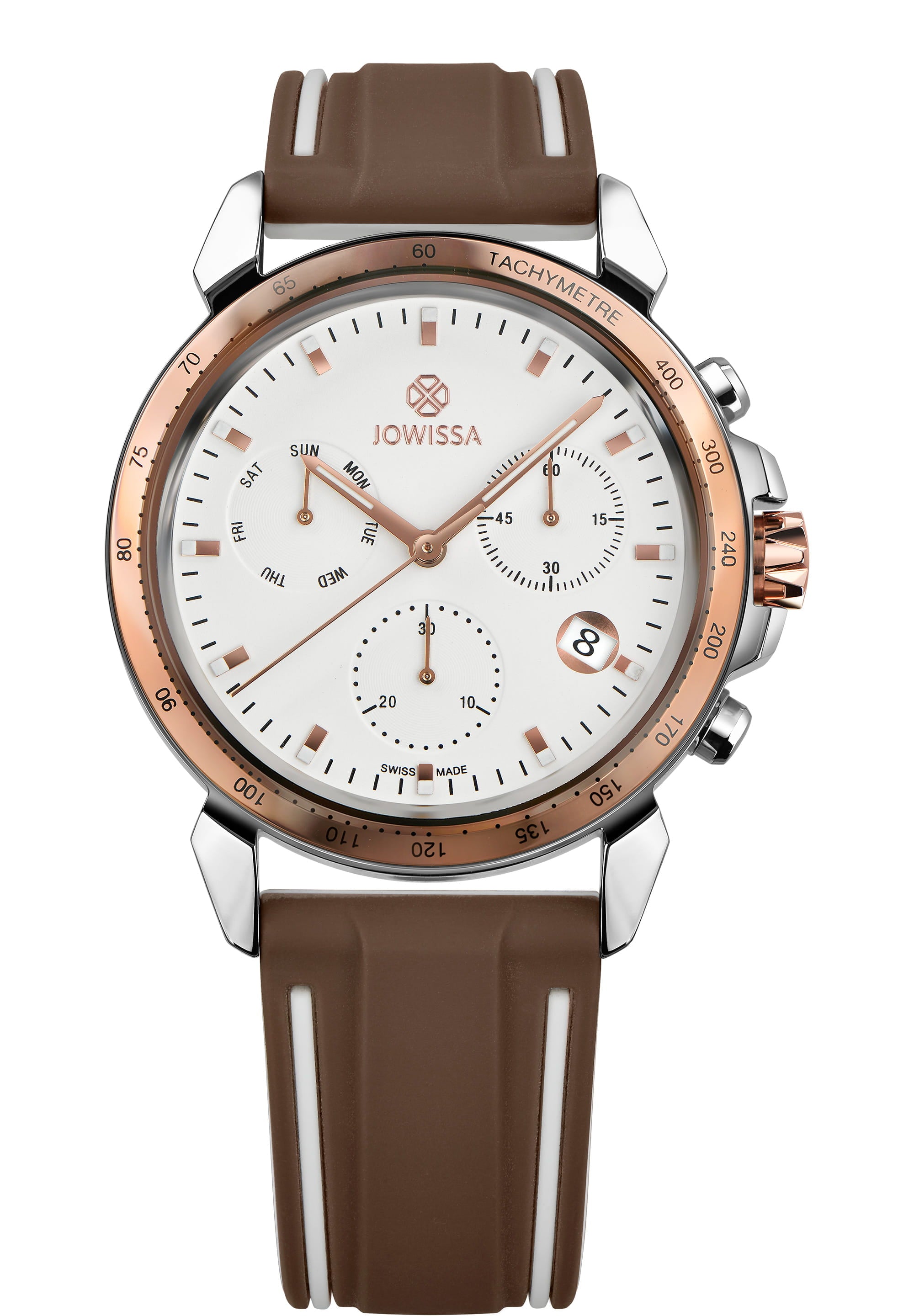 The LeWy 9 Swiss Men's Watch is available in a stylish combination of rose, white, and brown colors, making it a versatile accessory that can complement any outfit. The watch features a metallized bezel integrated into the glass with a tachymeter, adding a sporty touch to its overall design. The silicone strap is not only comfortable but also features a quick-release mechanism, allowing for easy interchangeability.