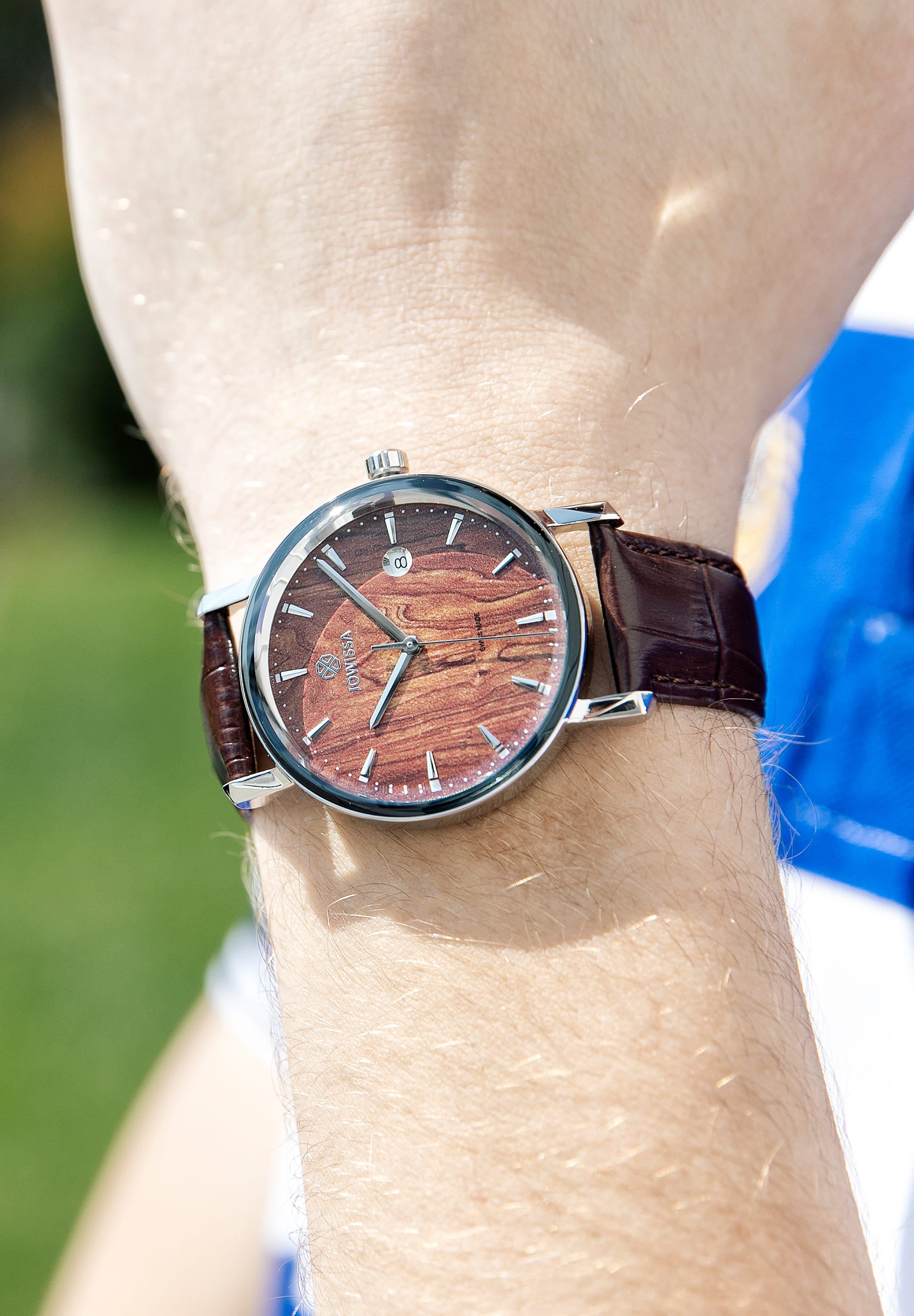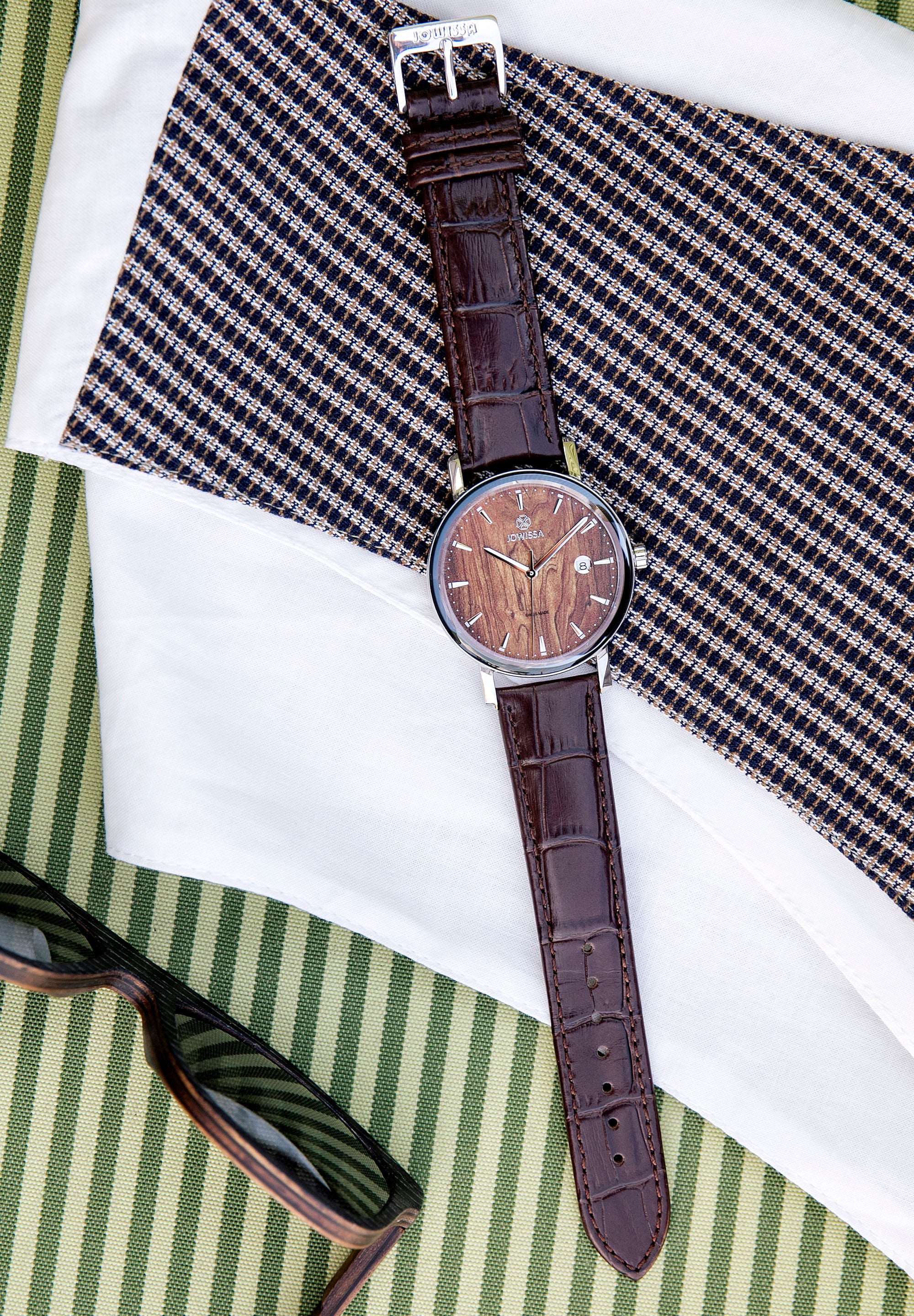 The Magno Swiss Men's Watch J4.277.L is a stunning timepiece that combines creativity and functionality. With its unique brown wood-effect dial, this watch offers a textured look that sets it apart from traditional designs. The silver indices and three hands provide a classic touch, while the date window adds practicality for everyday use.