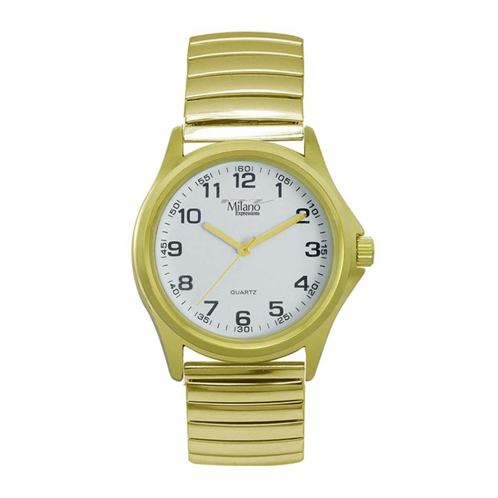The Oakland Gold Flex Strap Watch by M Milano Expressions is a stunning timepiece that combines elegance and functionality. With its sophisticated design and high-quality materials, this watch is perfect for both casual and formal occasions. The striking white dial provides a beautiful contrast against the gold flex strap, making it a standout accessory for any outfit.