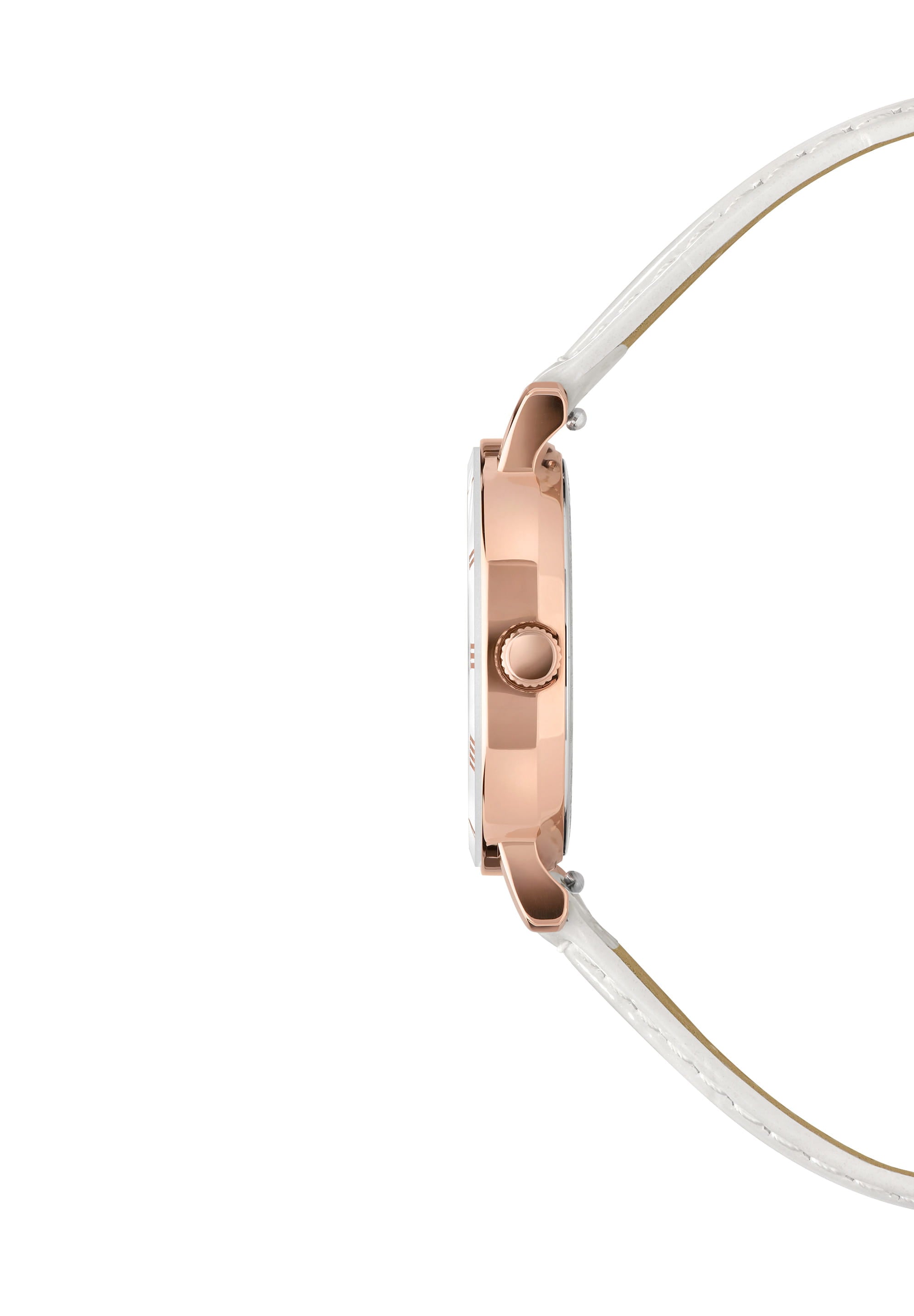 The watch boasts a polished stainless steel bezel adorned with filigree Roman numeral indices, adding a touch of sophistication to its overall look. The diamond Dauphine-style hands provide a classic touch, while the glossy white real leather strap ensures comfort and style. The strap is alligator-embossed, enhancing its luxurious appearance.
