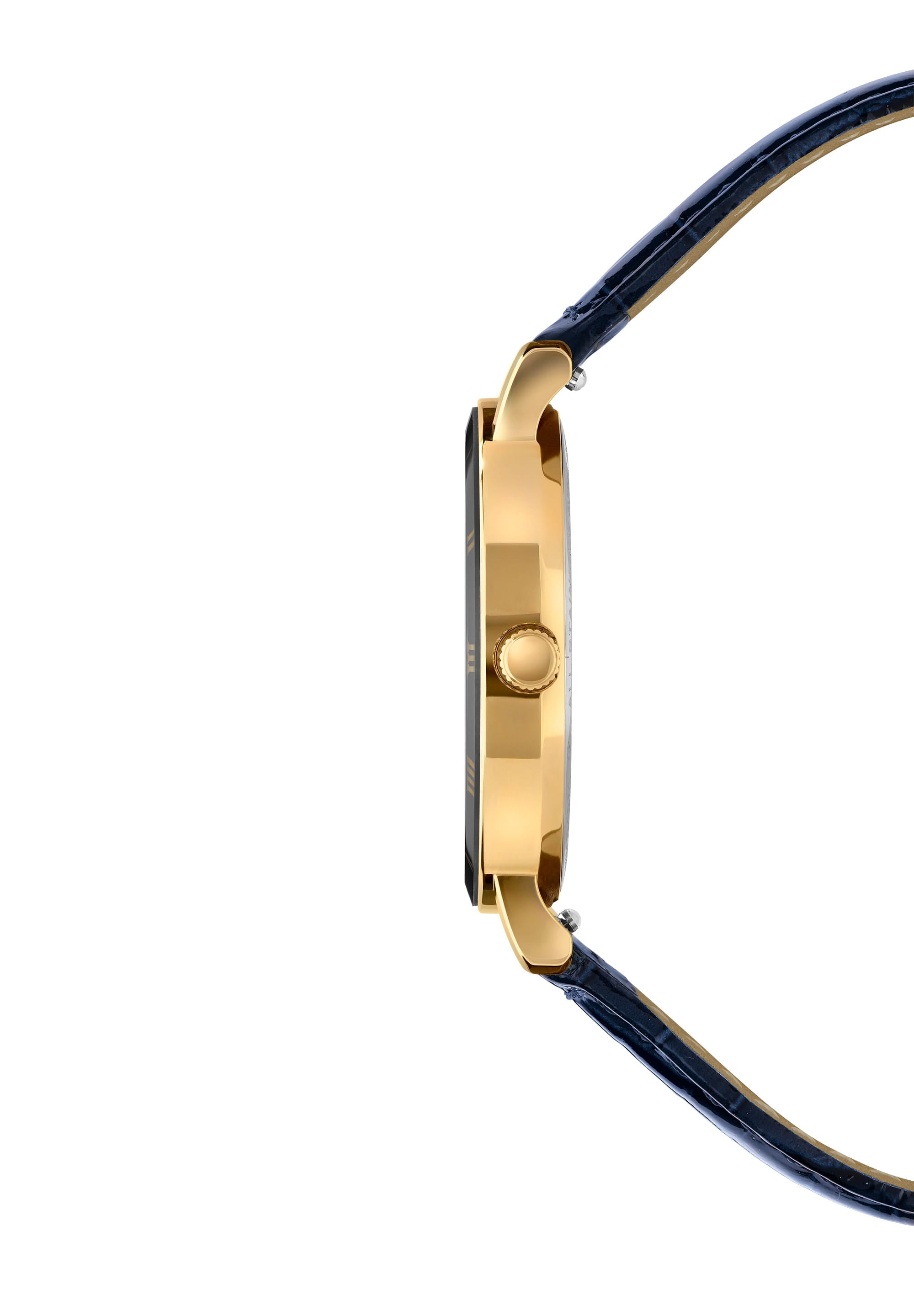 Roma Swiss Ladies Watch J2.271.M featuring a blue leather strap, gold-plated stainless steel case, and elegant Roman numeral dial.