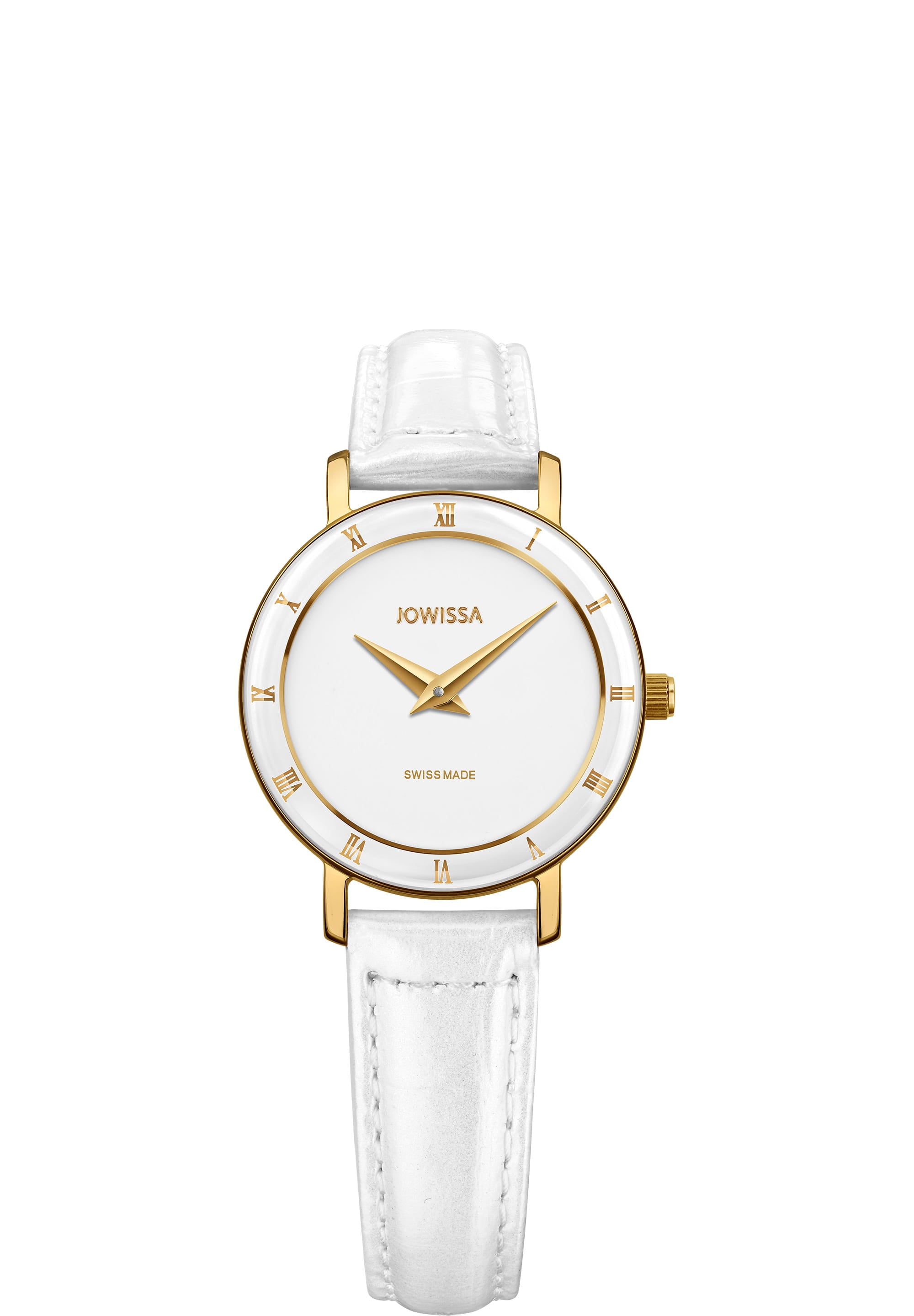 Introducing the Roma Swiss Ladies Watch J2.276.S, a stunning timepiece that embodies elegance and sophistication. This watch is perfect for women who appreciate minimalist design and high-quality craftsmanship. Made in Switzerland, it features a beautiful white watch dial complemented by a high-gloss white leather strap. The gleaming gold-tone Roman numerals add a touch of luxury, making it an ideal accessory for any outfit.