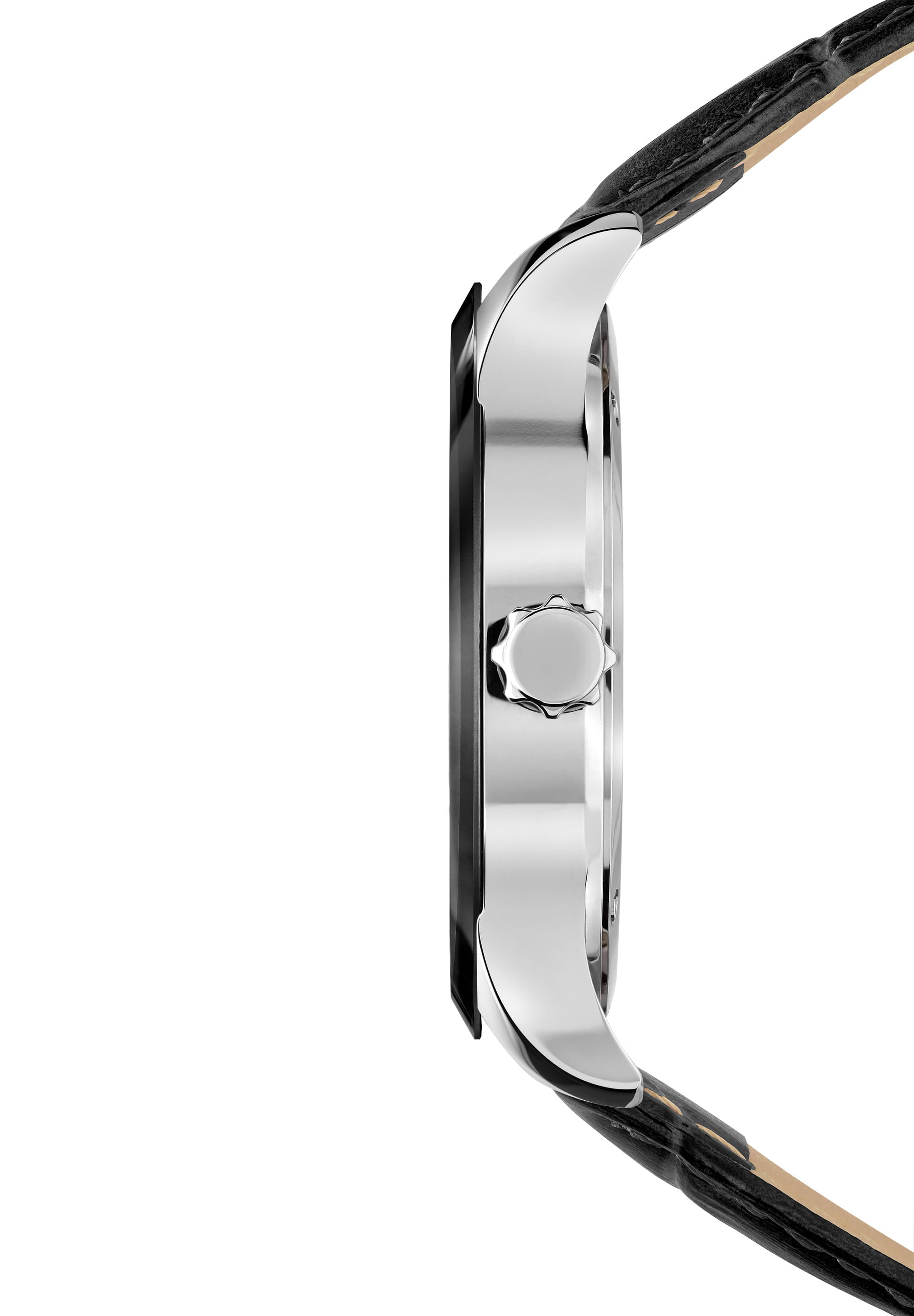 This watch is crafted with tempered mineral glass that is both scratch-resistant and polished for a refined look. The stainless steel case is gloss polished, providing a luxurious finish. The bezel is metallized and integrated into the glass, ensuring a seamless design. The back case is fixed with four screws, allowing for easy battery replacement when needed.