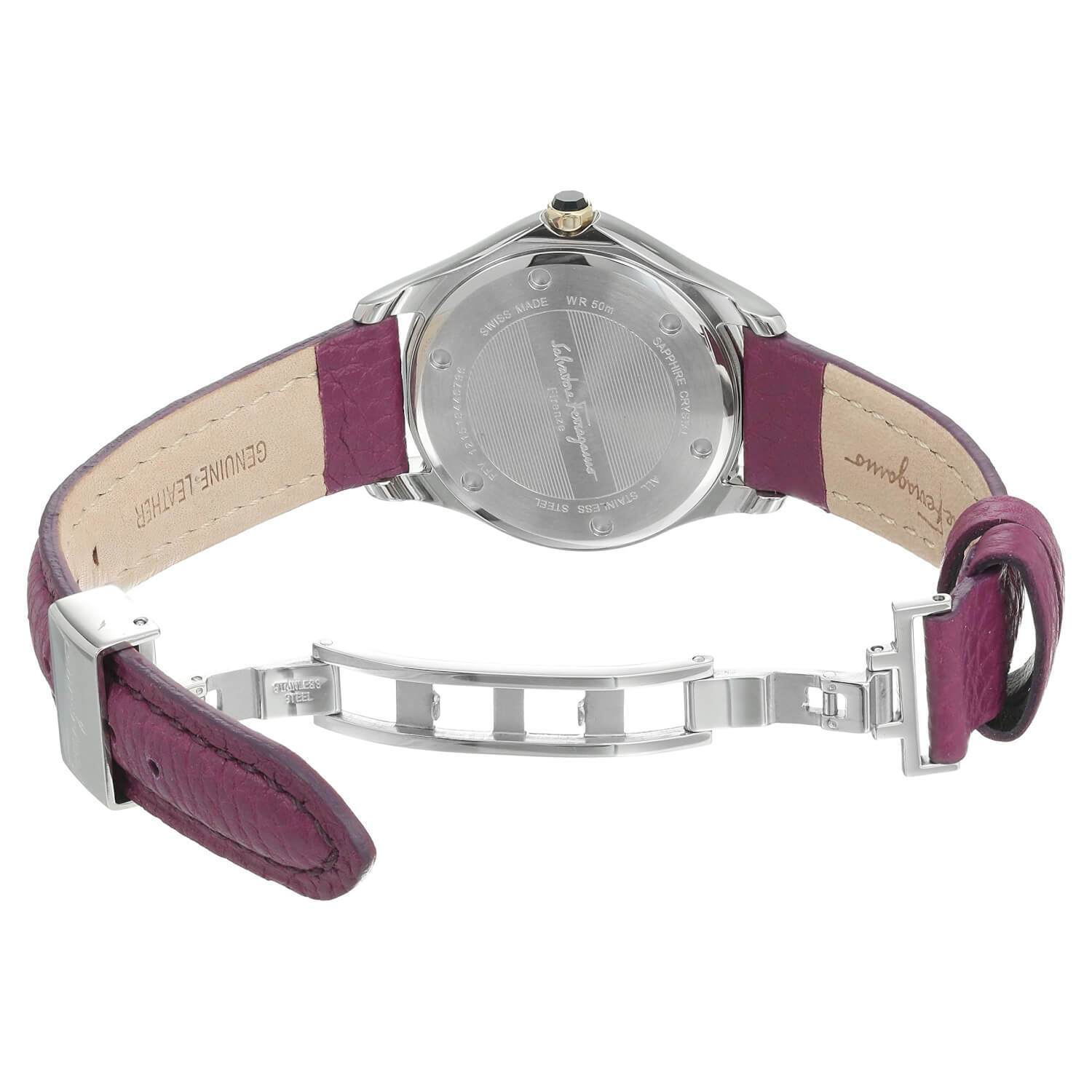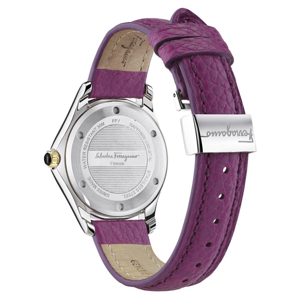 The Salvatore Ferragamo FFV030016 is equipped with a luxurious purple leather calf strap that adds a pop of color to the watch. The strap is designed for comfort and durability, ensuring that it fits securely on the wrist with a reliable deployment buckle. This thoughtful design element makes it suitable for both everyday wear and special occasions.