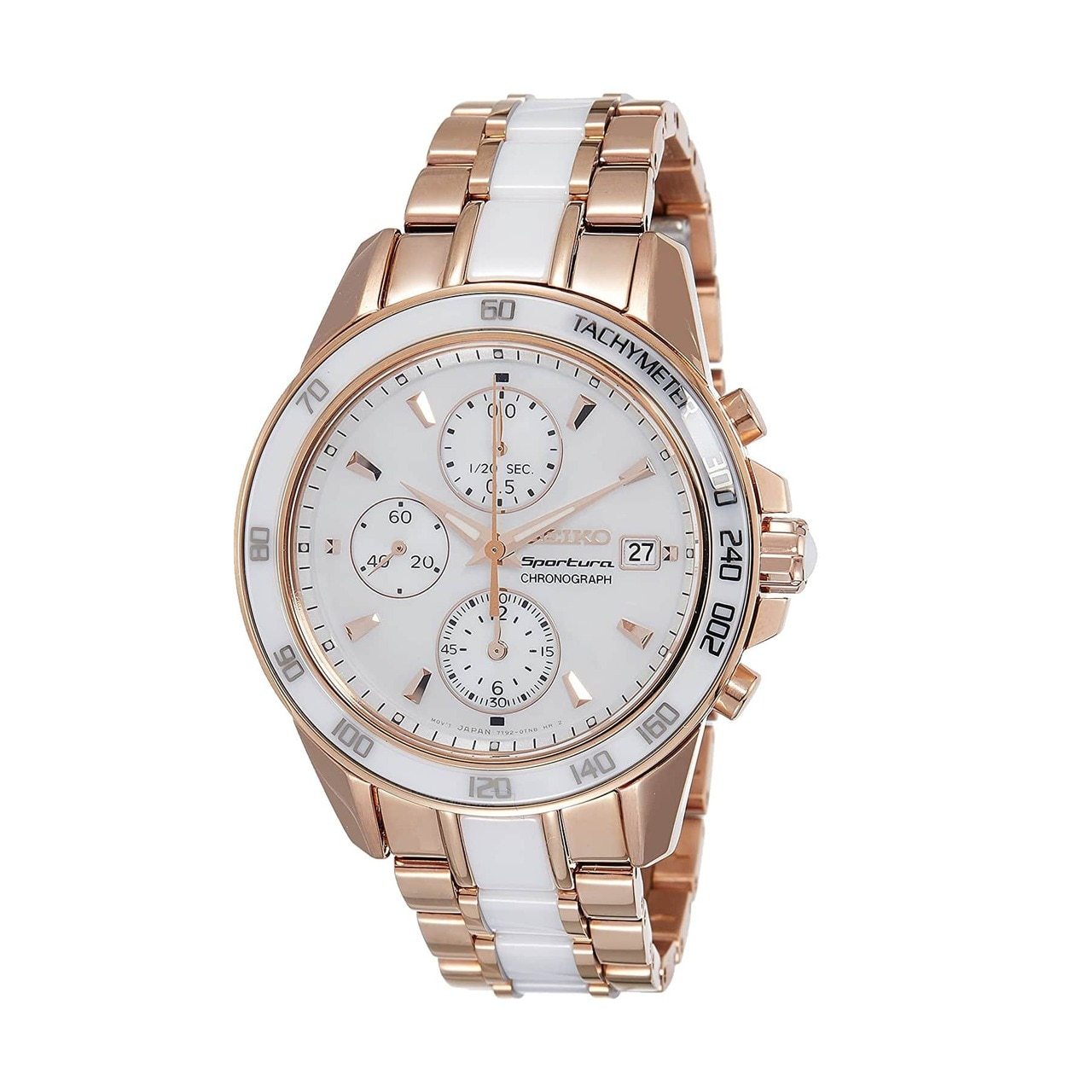 The Seiko SNDW98 Sportura Gold Stainless White Ceramic Mother of Pearl Dial Chronograph Watch is a stunning timepiece that combines elegance with functionality. This watch is designed for those who appreciate luxury and precision in their accessories. The unique bezel design and the star-speckled glam of the mother of pearl dial make it a standout piece for any occasion.