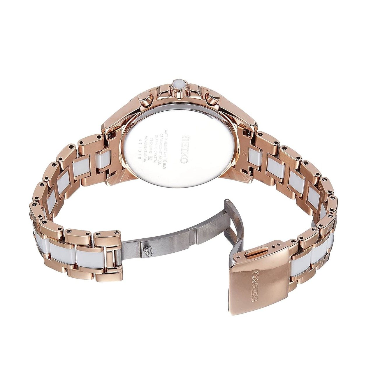 The Seiko SNDW98 features a rosegold tone stainless steel case that not only adds to its aesthetic appeal but also ensures durability. The case has a diameter of 38 millimeters and a thickness of 10 millimeters, making it a perfect fit for most wrists. The watch is fastened with a rosegold tone stainless steel bracelet that includes white ceramic center links, providing a comfortable and stylish wear.