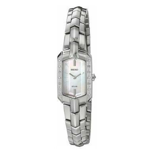 The Seiko SUP329 Tressia Solar Stainless Steel Mother of Pearl Women's Diamond Watch is a stunning timepiece that combines elegance with functionality. Crafted with a polished solid stainless steel case, this watch is designed for women who appreciate both style and practicality. With dimensions of 16mm across and 7mm high, it is perfectly sized for a comfortable fit on the wrist.