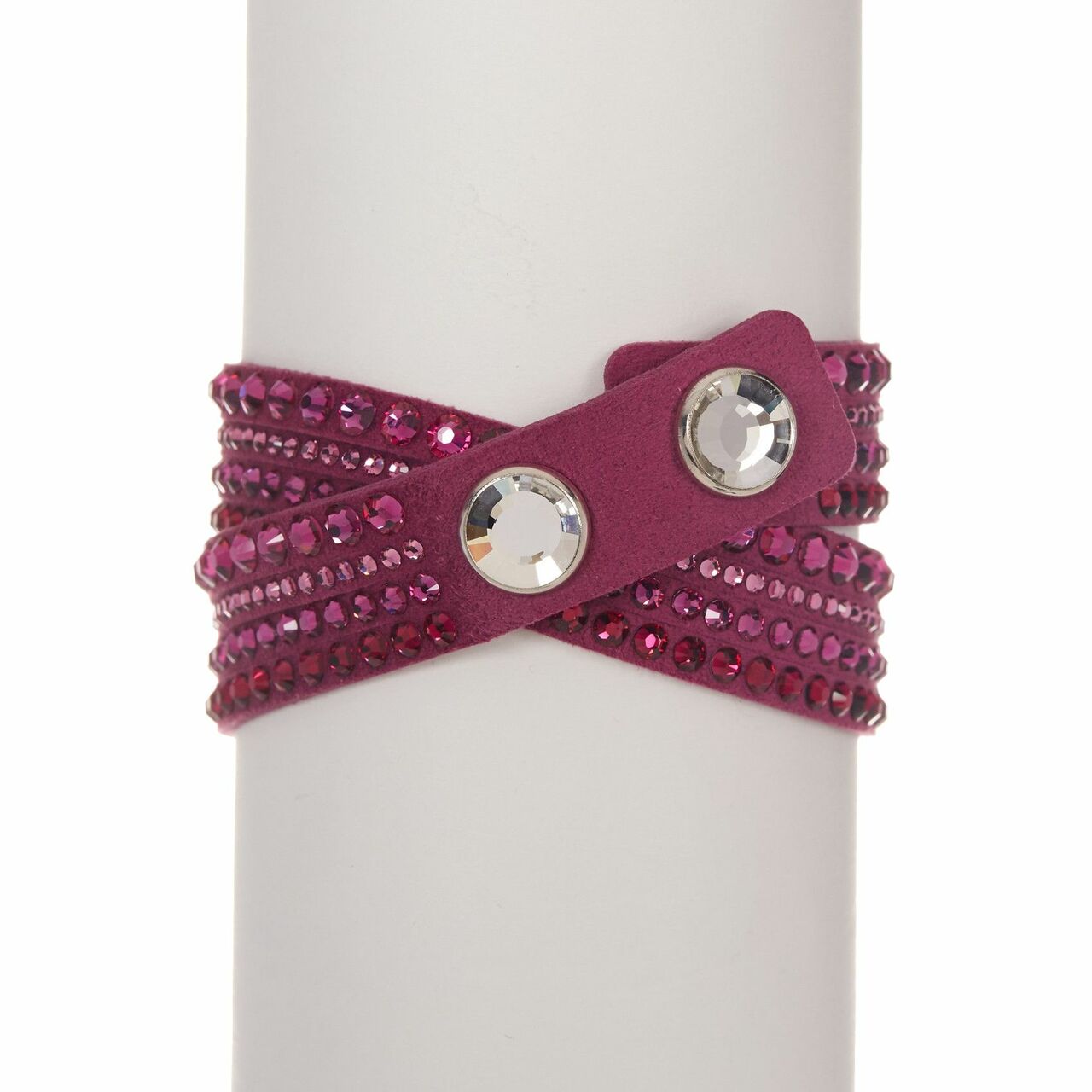 The design of the Swarovski Slake bracelet is both unique and functional. The fuchsia Alcantara fabric is soft against the skin, ensuring that it can be worn comfortably throughout the day. The bracelet wraps around your wrist in a twisted look, adding a touch of flair to any outfit. The adjustable closure features two clear crystal buttons, allowing you to customize the fit to your liking.