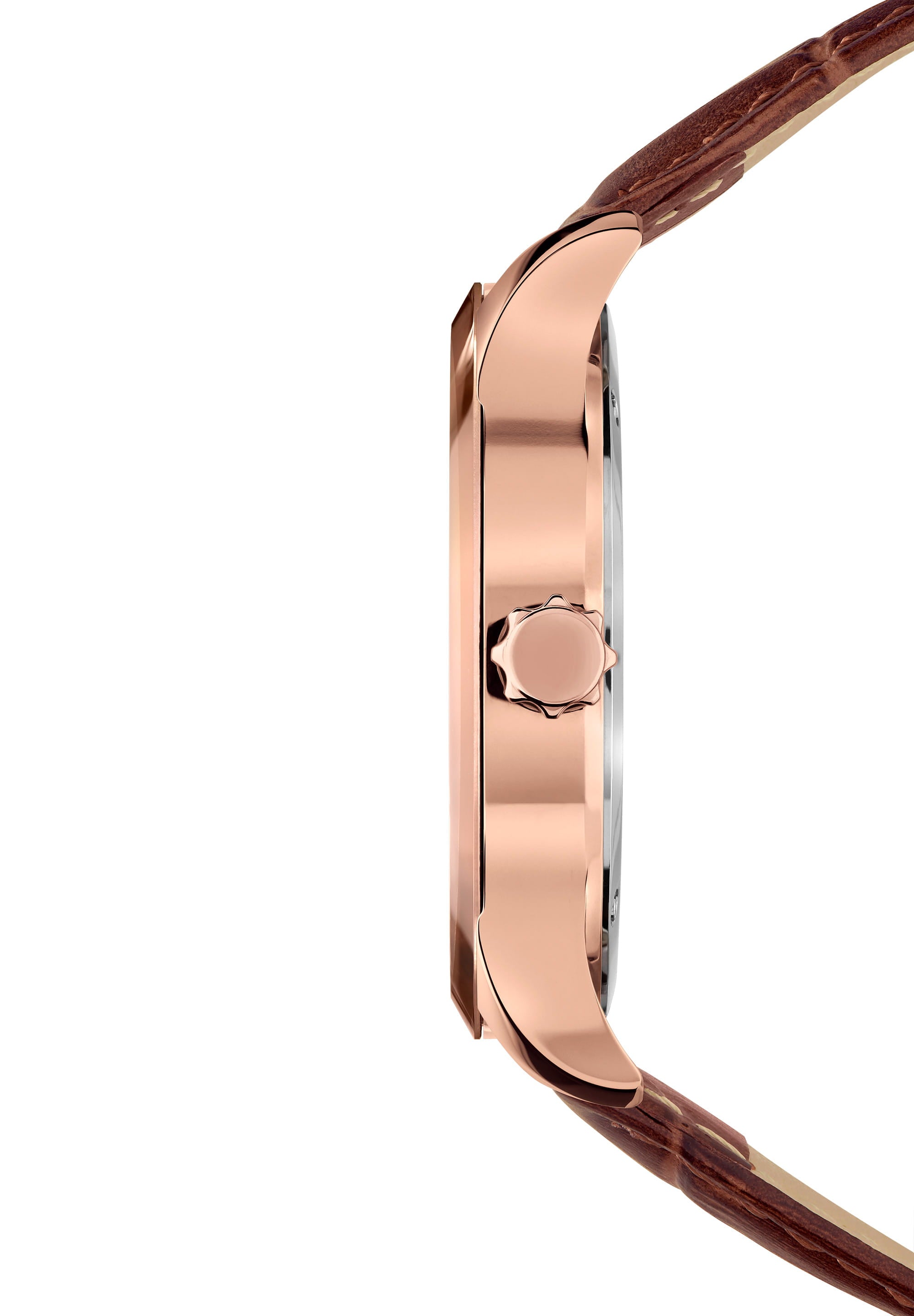 The watch features a semi-matt alligator-embossed genuine leather strap that complements the rose-golden indices on the dial. The combination of blue, brown, and rose gold creates a striking visual appeal that is both modern and timeless. The stainless steel case adds durability while the polished edge of the tempered mineral glass enhances its overall elegance.