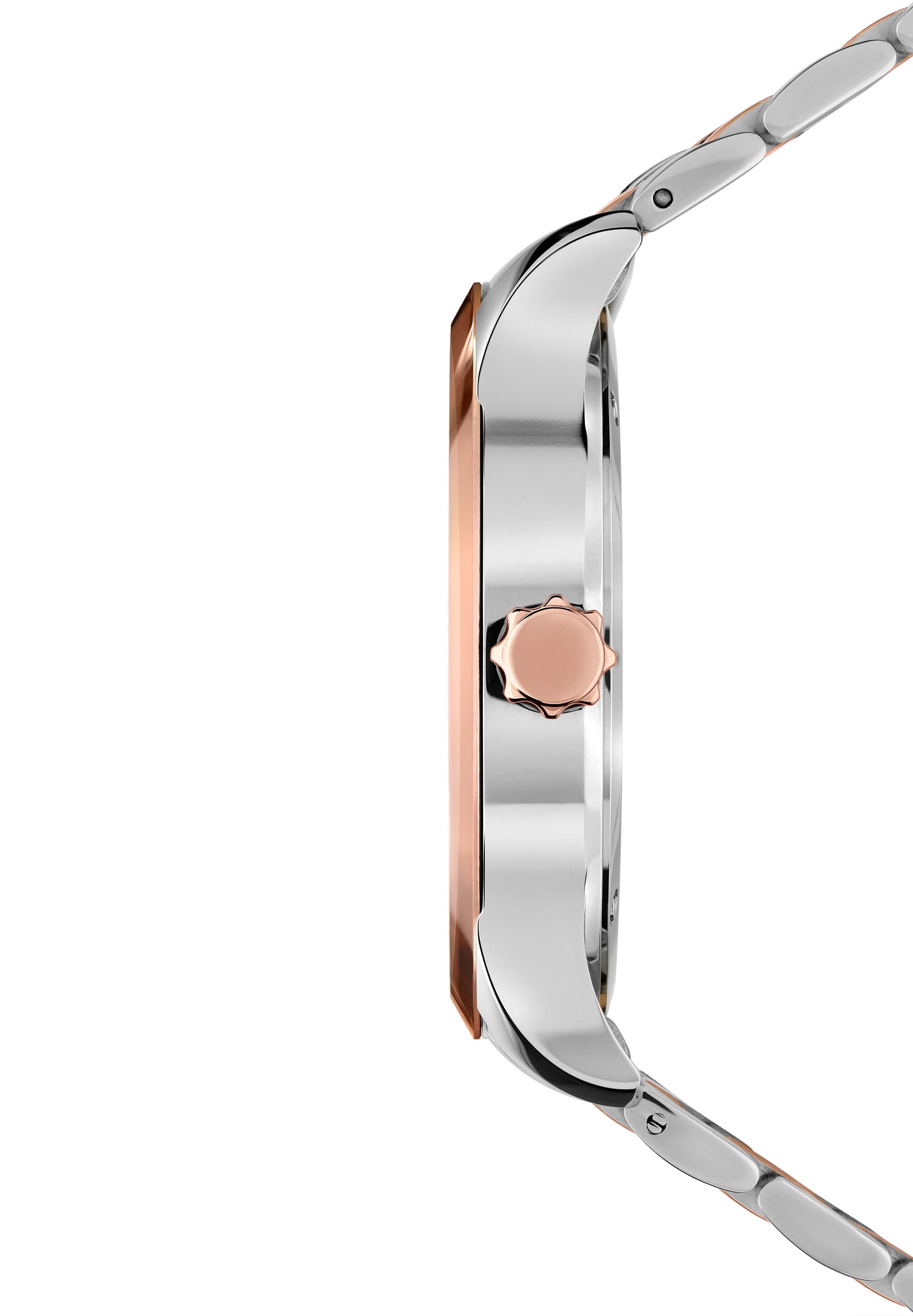 With a handsome 45mm case, the Tiro watch stands out on your wrist. The shiny, sunray silver dial is complemented by rose-gold hour markers, creating a striking contrast that enhances visibility and style. The applied baton hour indices and printed minutes provide a classic touch, while the triangular, hollow, Dauphine-style hands add a modern flair. This combination of design elements makes the Tiro watch a true statement piece.