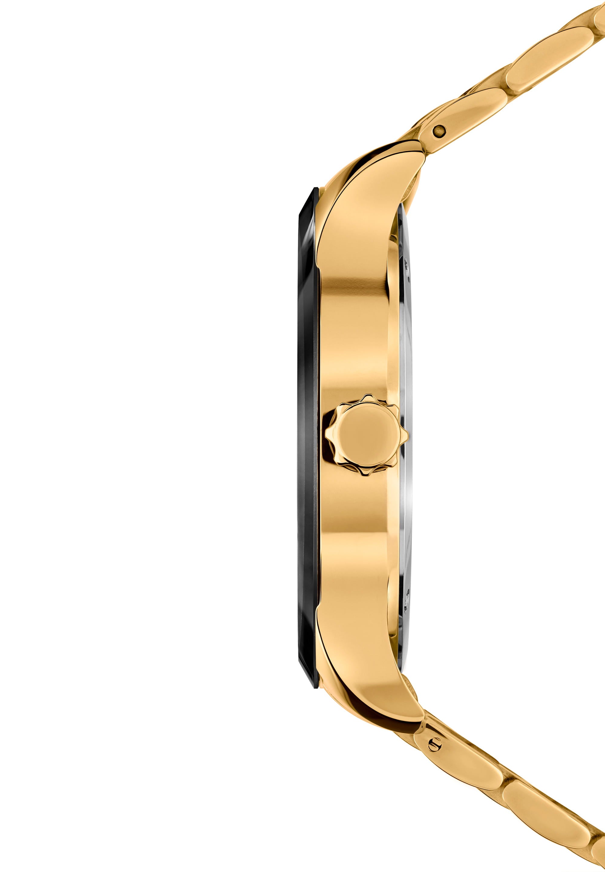 The Tiro watch boasts a shiny, sunray black dial that is both elegant and easy to read. The applied baton hour indices and printed minutes provide a sophisticated touch, while the triangular, hollow, Dauphine-style hands add a modern flair. The watch case is made from high-quality stainless steel, polished to a gloss finish and plated in gold, enhancing its luxurious appearance.