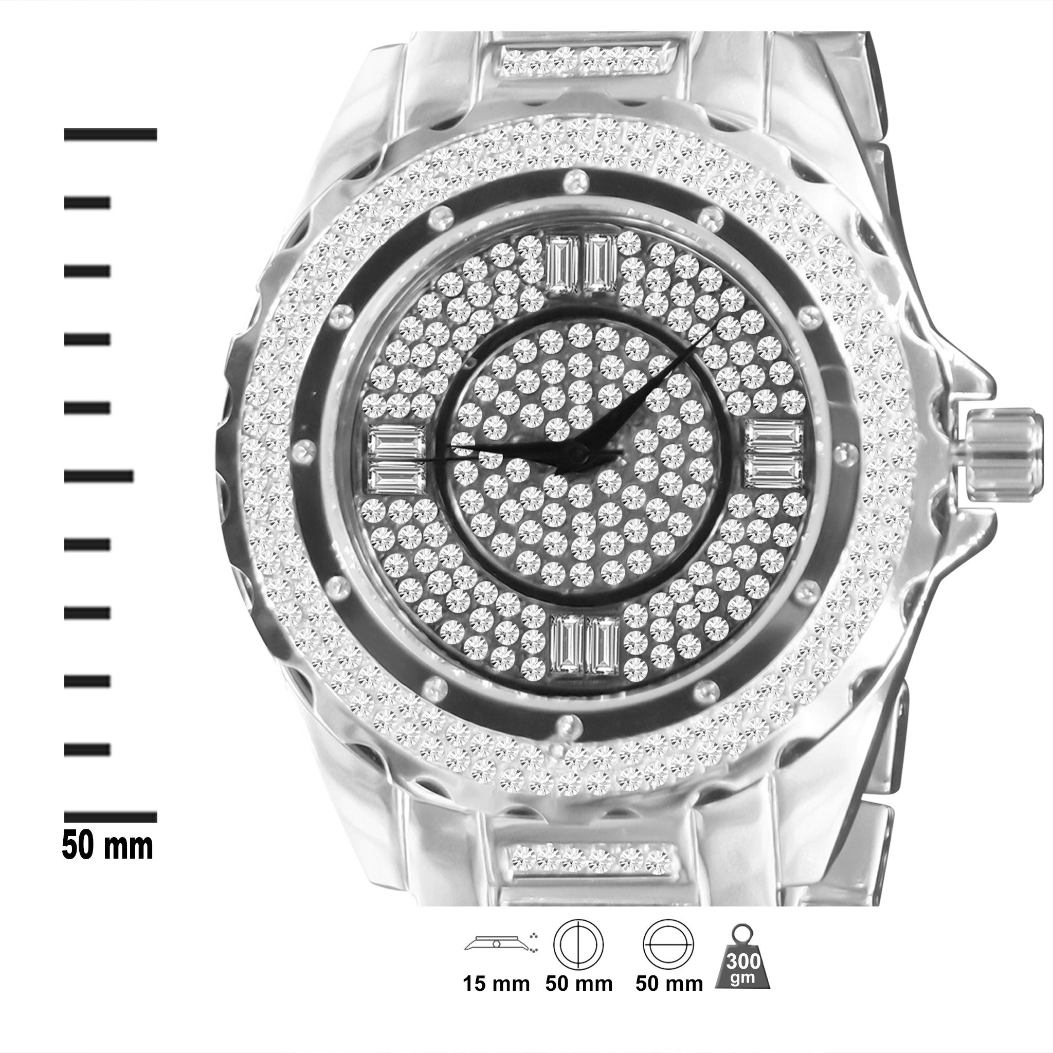 Constructed with a case thickness of 15mm, the Ultra Bling Watch is built to last. The robust design ensures that it can withstand daily wear and tear while maintaining its stunning appearance. The case height of 55mm and width of 51mm provide a bold presence on your wrist, making it a perfect choice for those who love oversized watches.