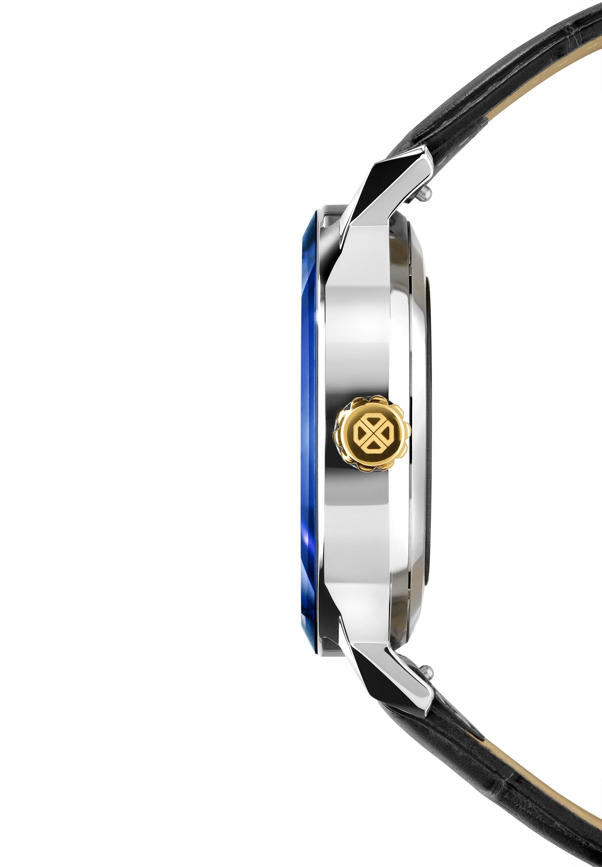 Hand-assembled in Switzerland, the Virtuo watch embodies the high standards of Swiss craftsmanship. Each component is meticulously crafted to ensure durability and precision, making it a worthy addition to any watch collection. The combination of steel, blue, gold, and black colors creates a striking visual that is sure to turn heads.